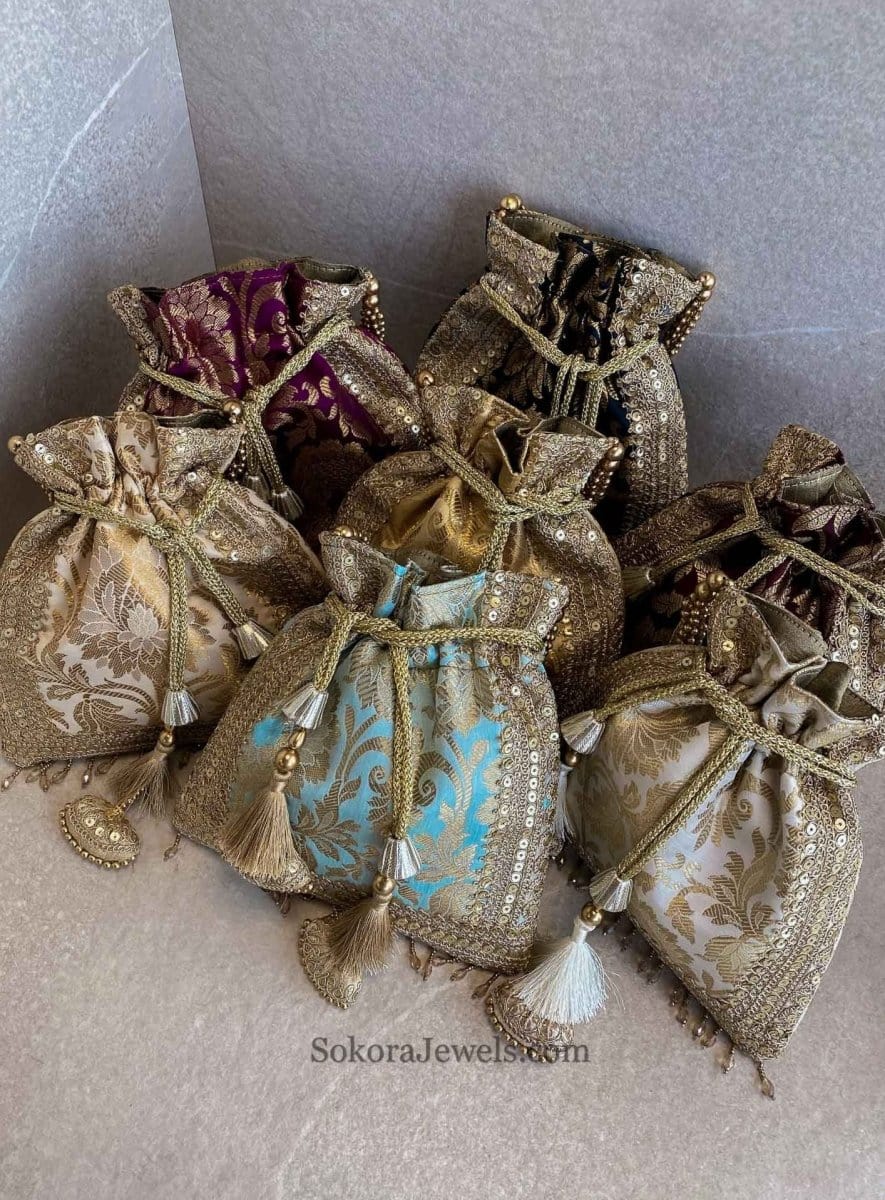 Damask printed bags with sequin details, tassel ties and beaded handle. Available in 7 beautiful shades.