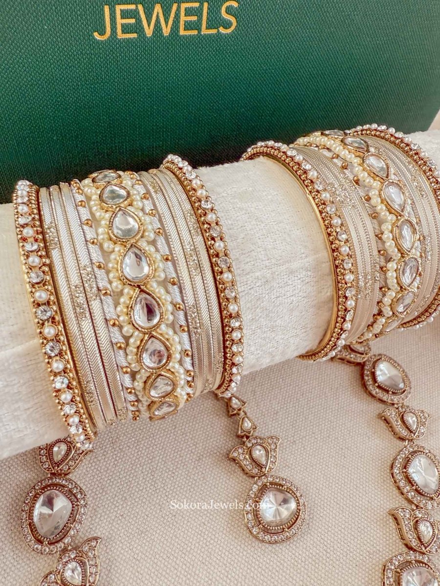 This beautifully presented jewellery set includes our Clear Rhea faux Kundan necklace, earring & tikka set with beautiful matching a small matching bangle set..