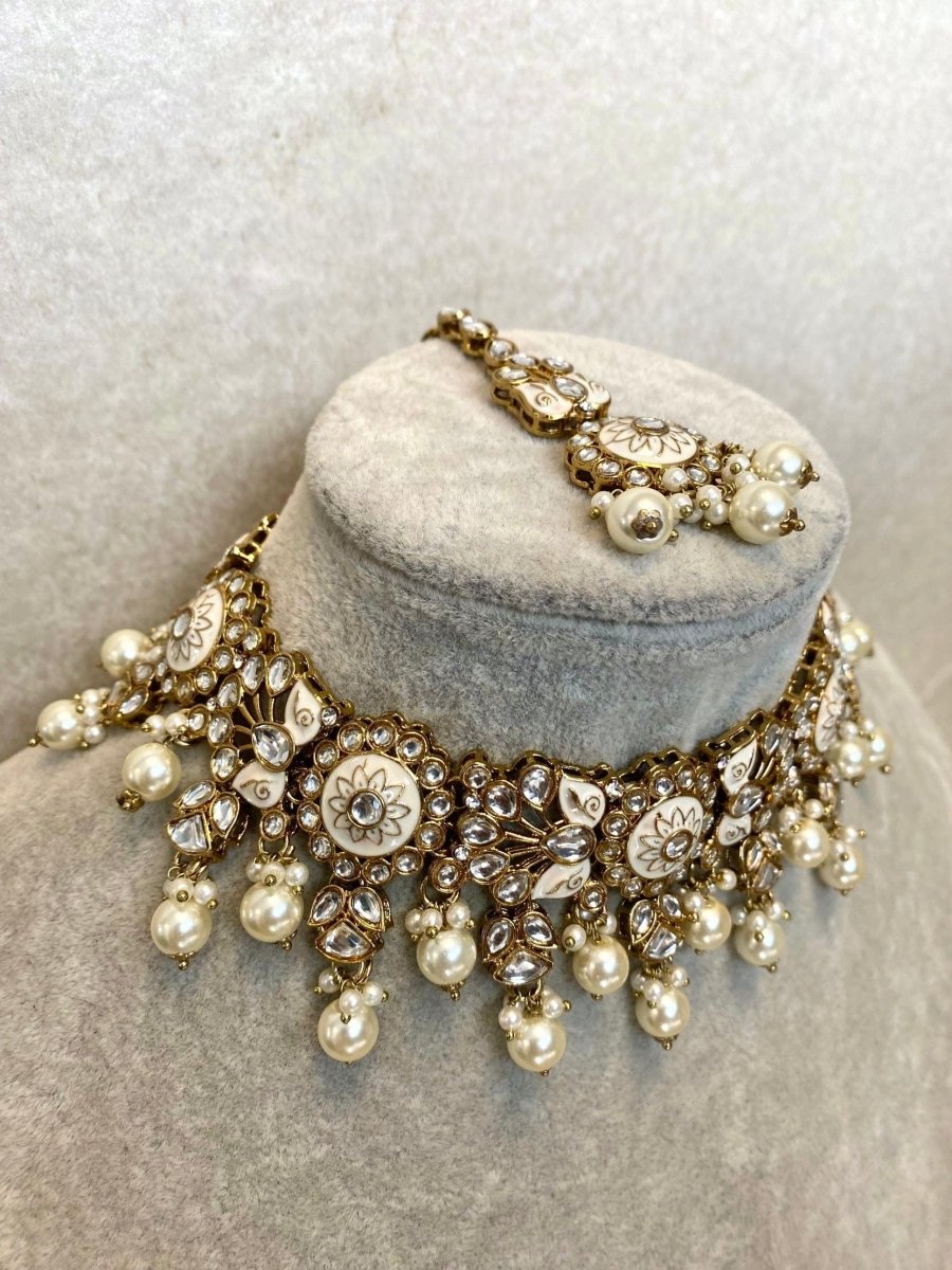Flexible necklace set decorated with meenakari paint, faux kundan gems and pearls