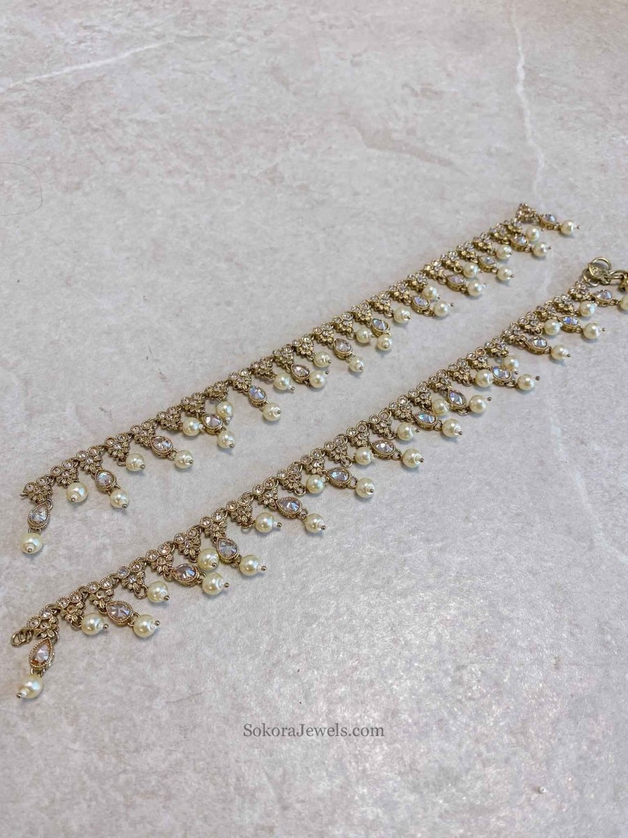 Luxury Champagne zircon stone detail anklets in antique gold with pearl beads