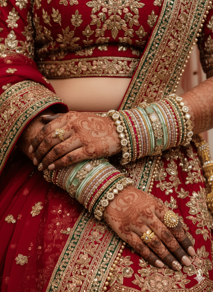 Large stack of luxurious antique Gold and zircon stone bangles with a mix of light and dark pinks & green shades.