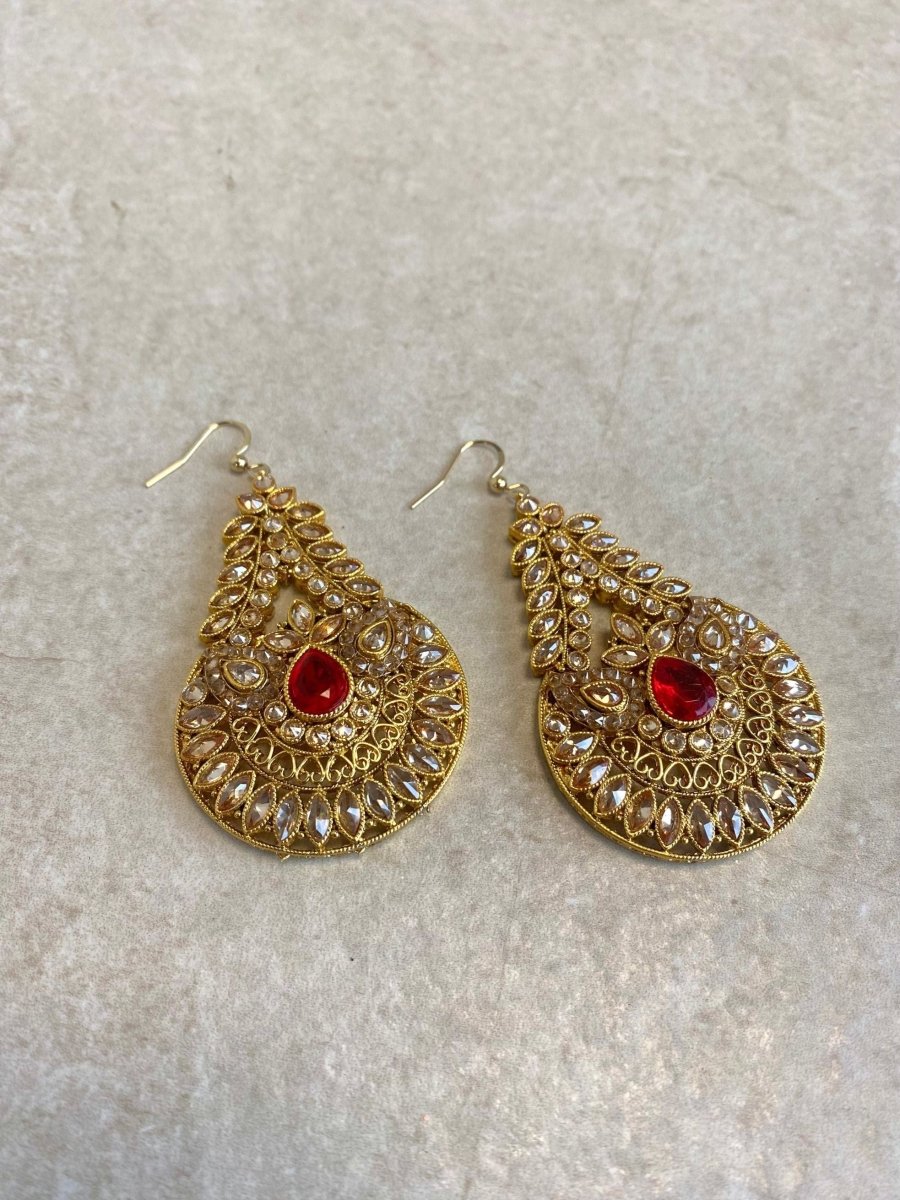 Stunning bright gold drop earrings with champagne & deep red crystals.
