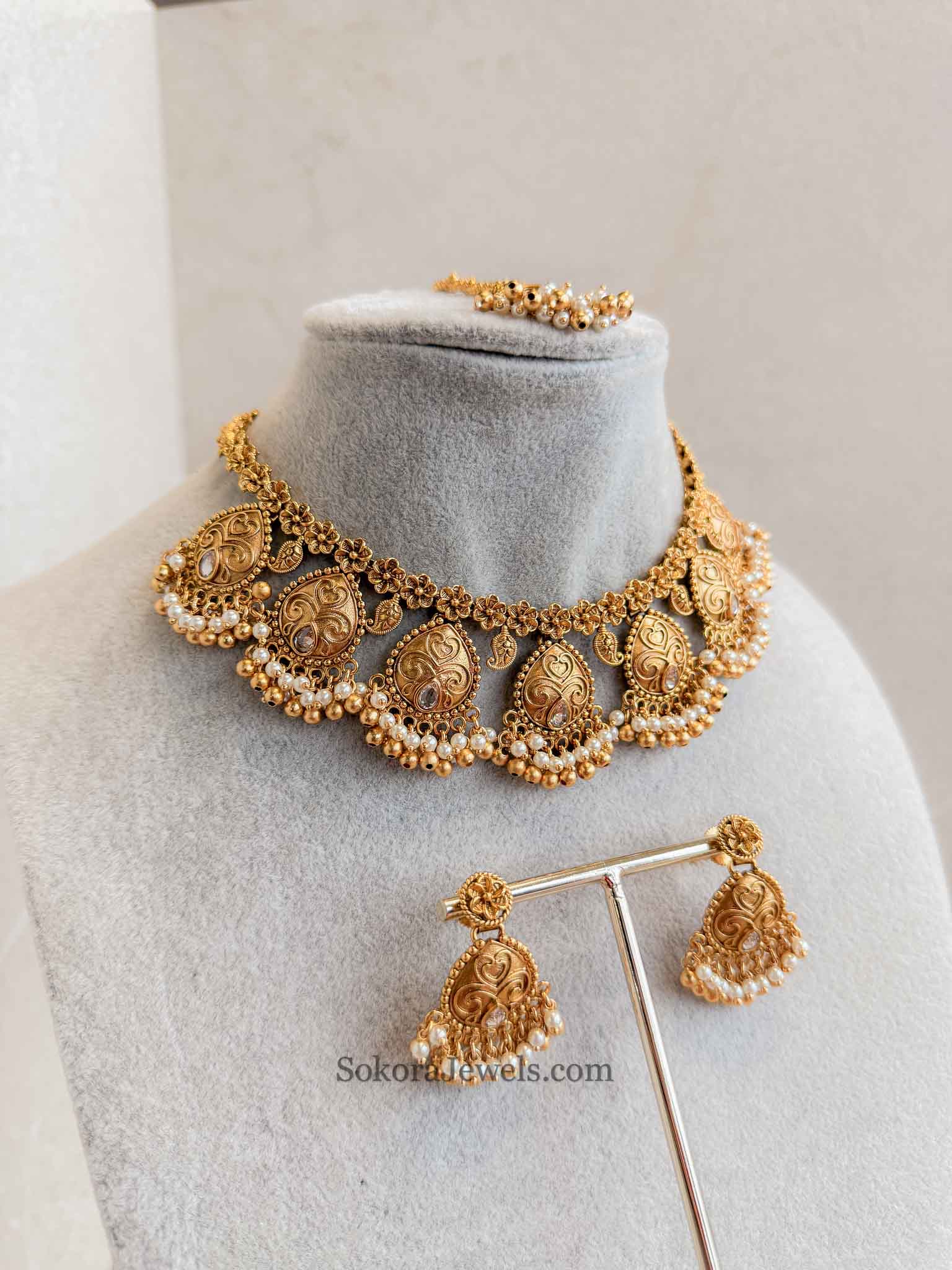Bright gold 1 gram plated intricate necklace set with hanging pendants and pearl beads. Comes with matching flat earrings and tikka.