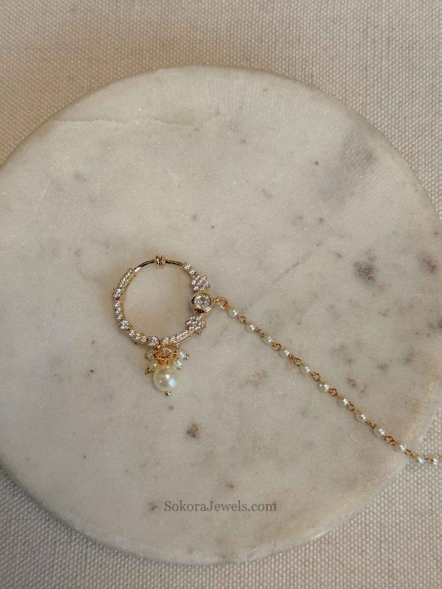 Left hand side 1 inch Bright Gold nose ring with kundan gem, diamante stones and pearls.