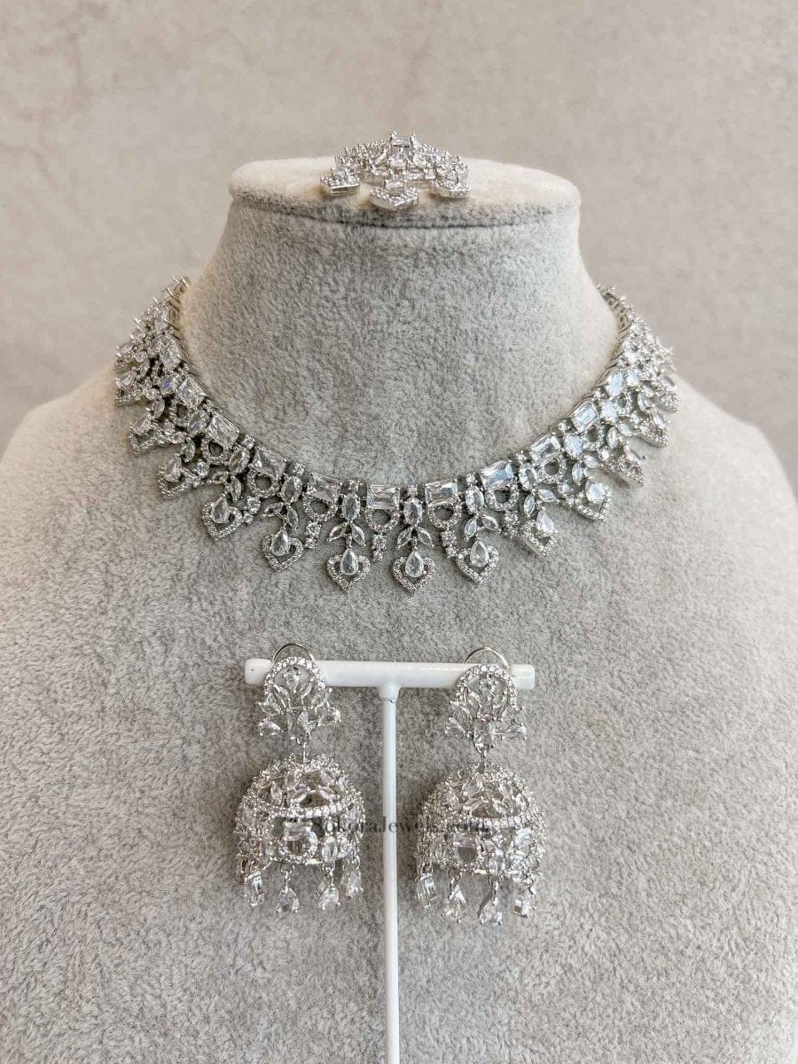 Crystal drop Earrings (3 inch length). Necklace width 1 inch. Tikka length 2 inches.