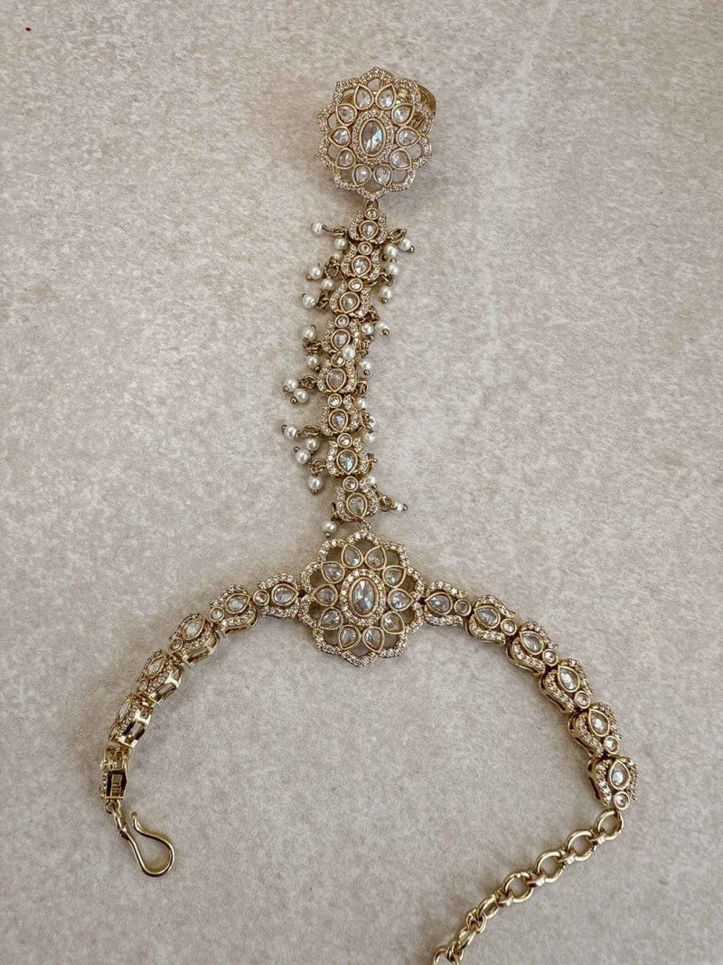 Antique gold hand harness with clear and golden zircon crystals finished with clusters of golden beads. Ring and wrist Size is adjustable to fit.