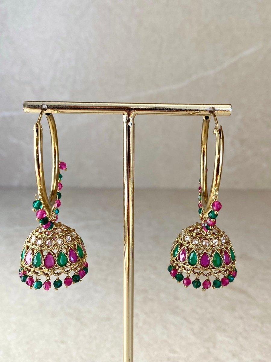 Medium jhumka Hoop earrings with coloured stonework and bead details.