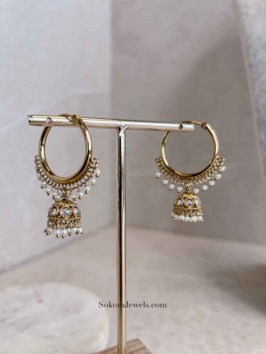Crystal and white pearl design light weight antique gold Hoop earrings