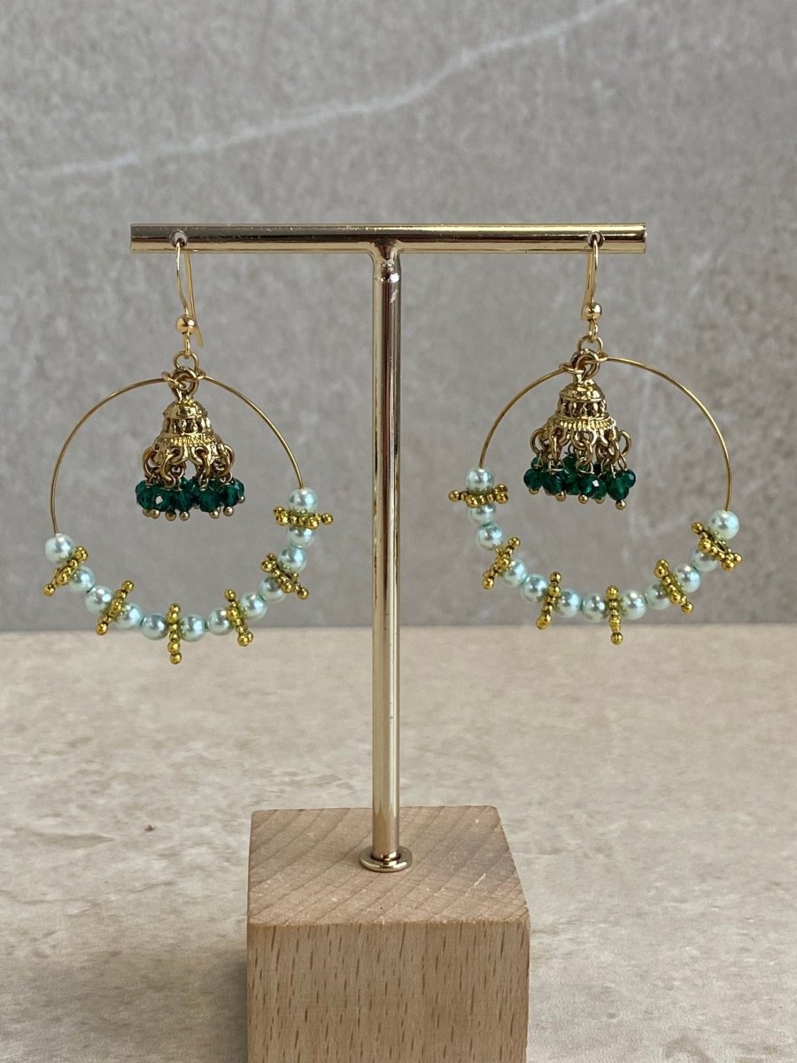 Antique Gold Hoop earrings with mint pearlescent beads and a mini jhumka drop with green beads.