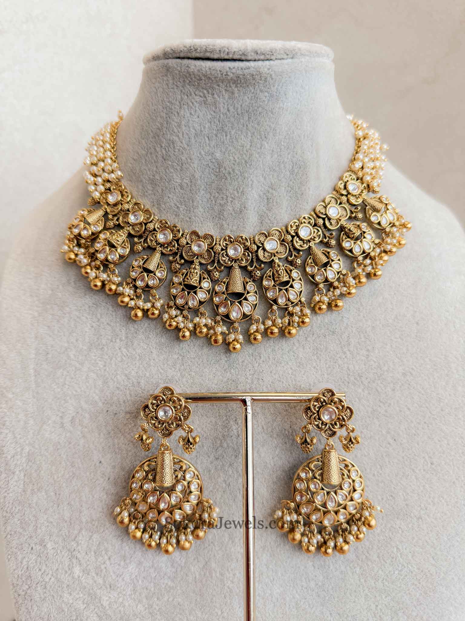 Statement 1 gram Gold polish necklace set with pearls, gold ball beads and kundan gems.