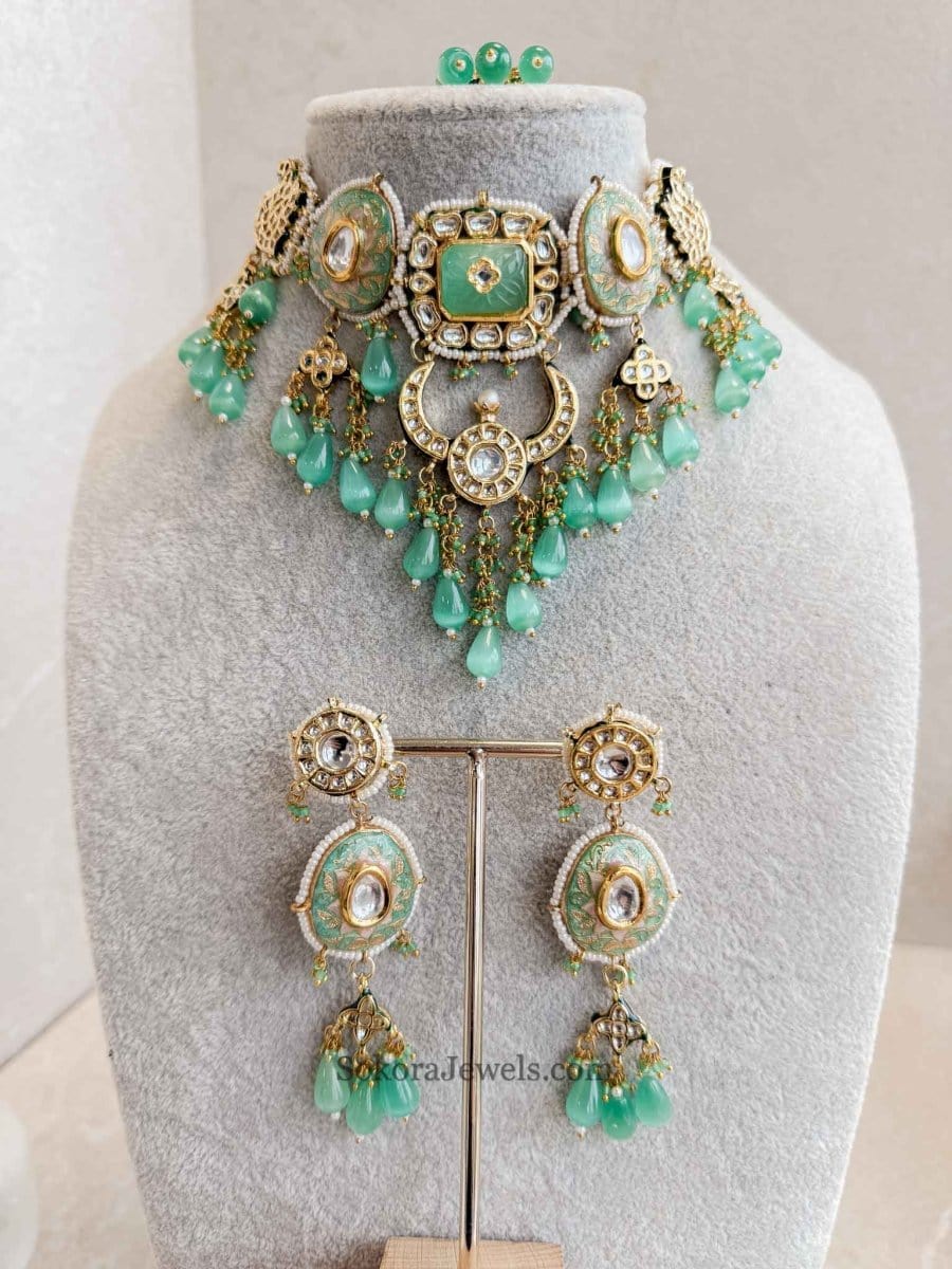 Large flexible choker set decorated with meenakari paint, kundan gems and colourful beads.