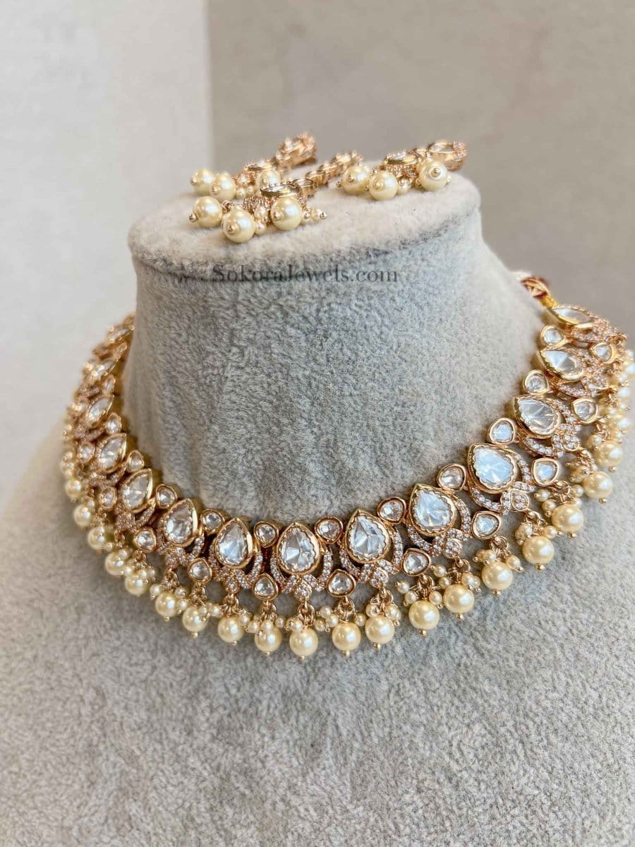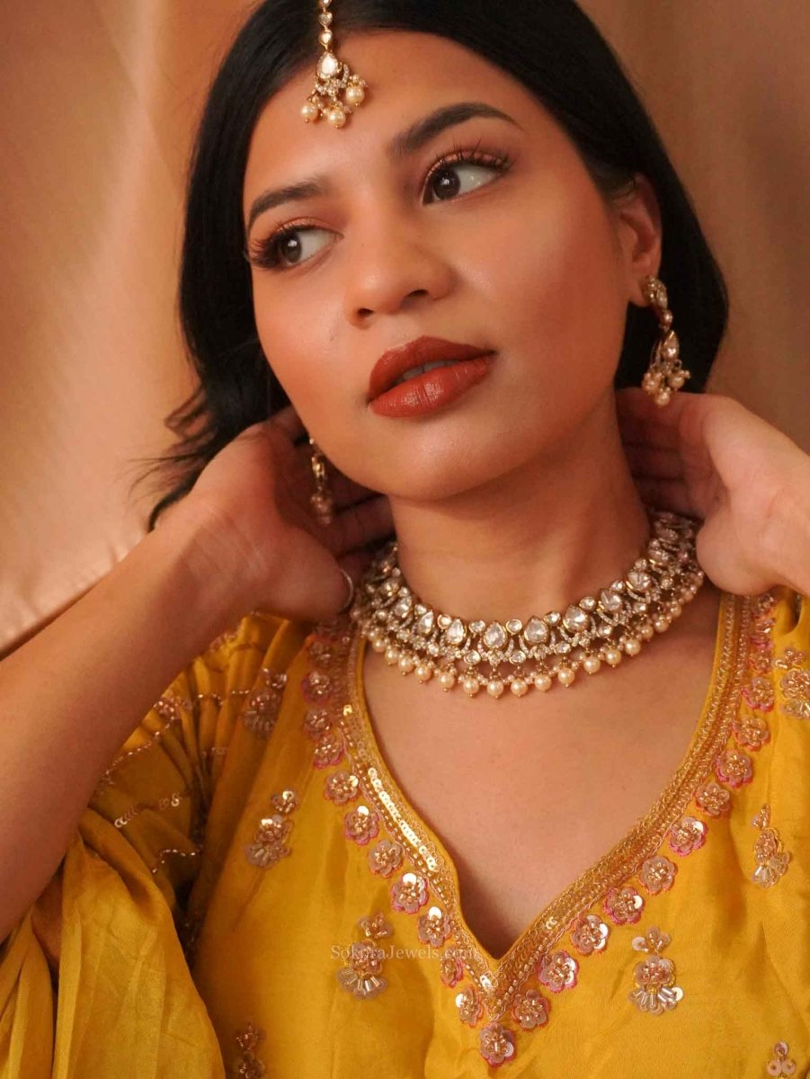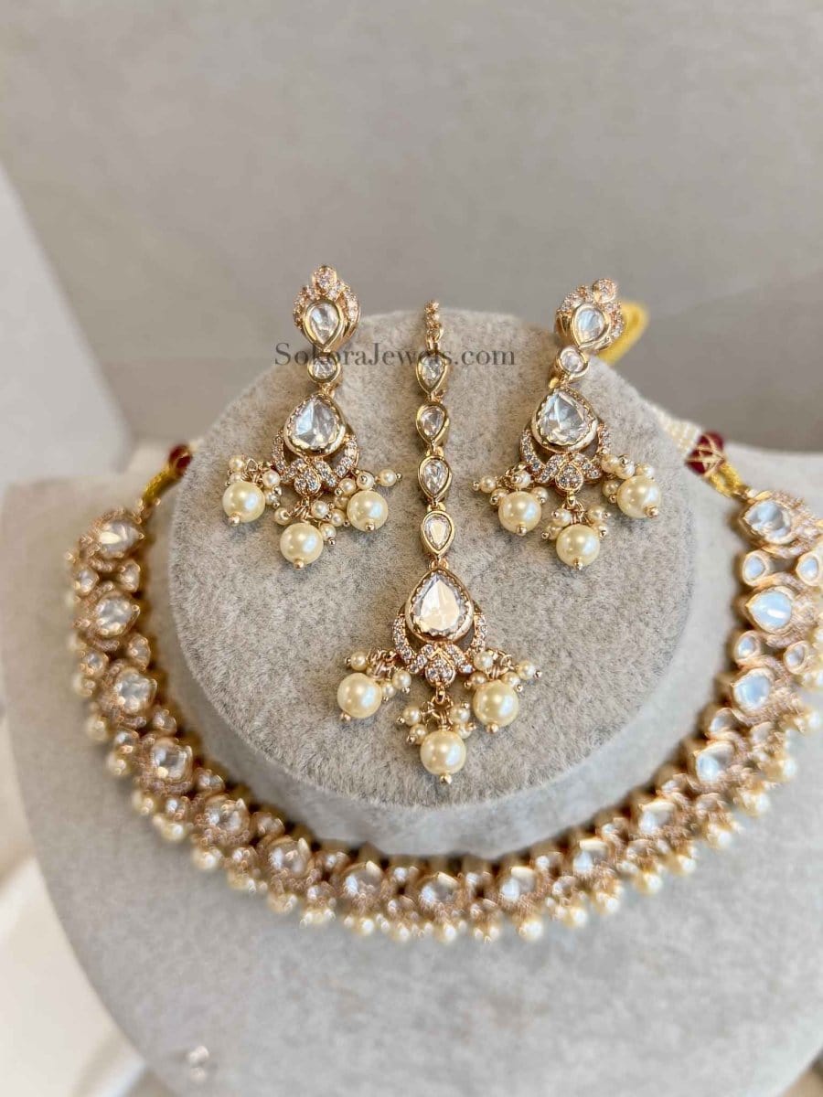 Luxury Moissanite Kundan gem and cubic zirconia stone mix Necklace and earring set finished with pearl beads. Earrings and tikka measure 2 inch length and are light weight.
