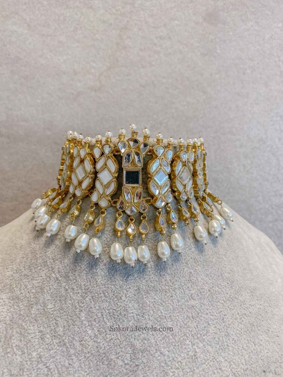 Stunning statement kundan Choker with mirror work and pretty pearl beads.