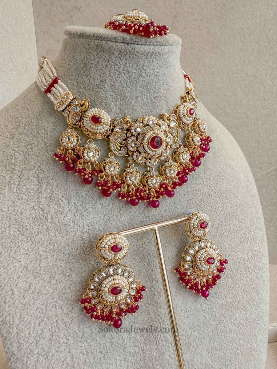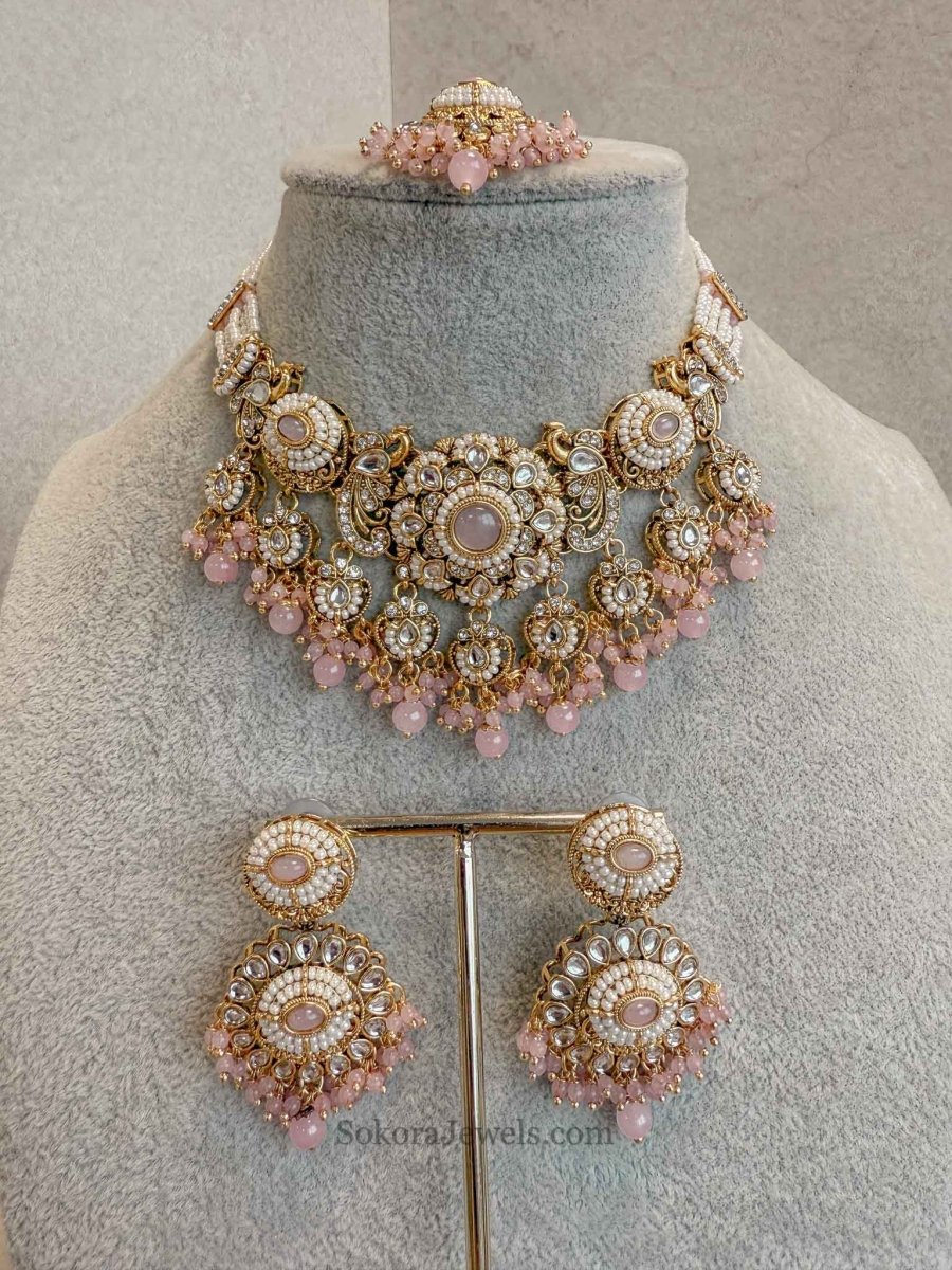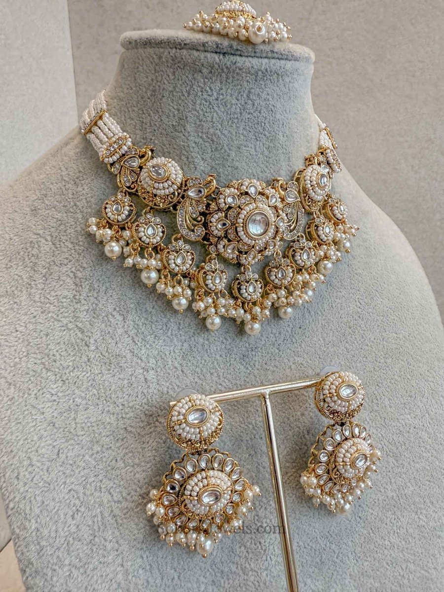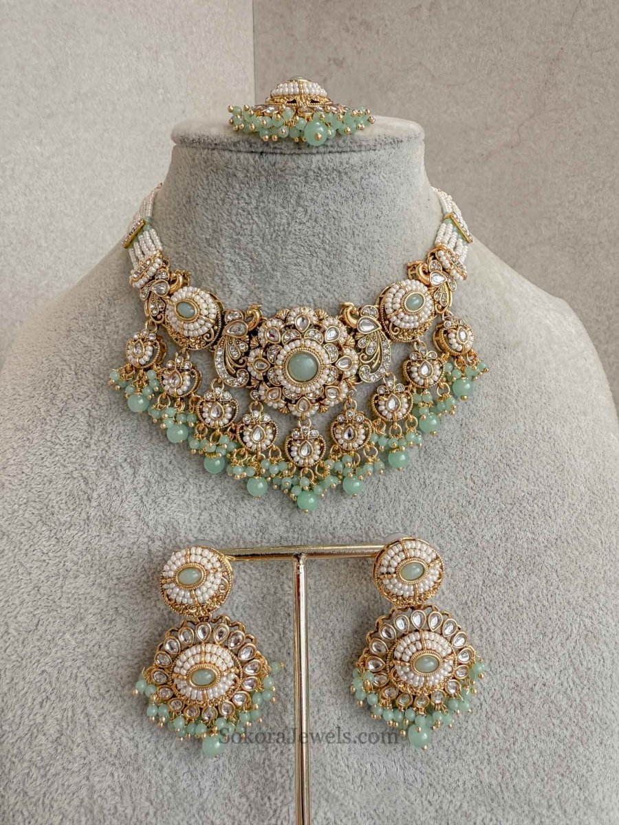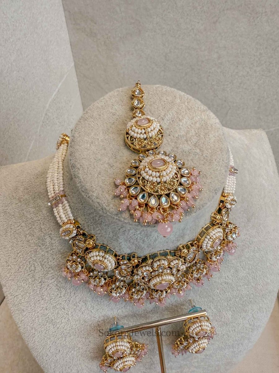 Beautifully intricate gold based choker adorned with faux kundan gems and colourful beadwork with matching earrings and tikka.