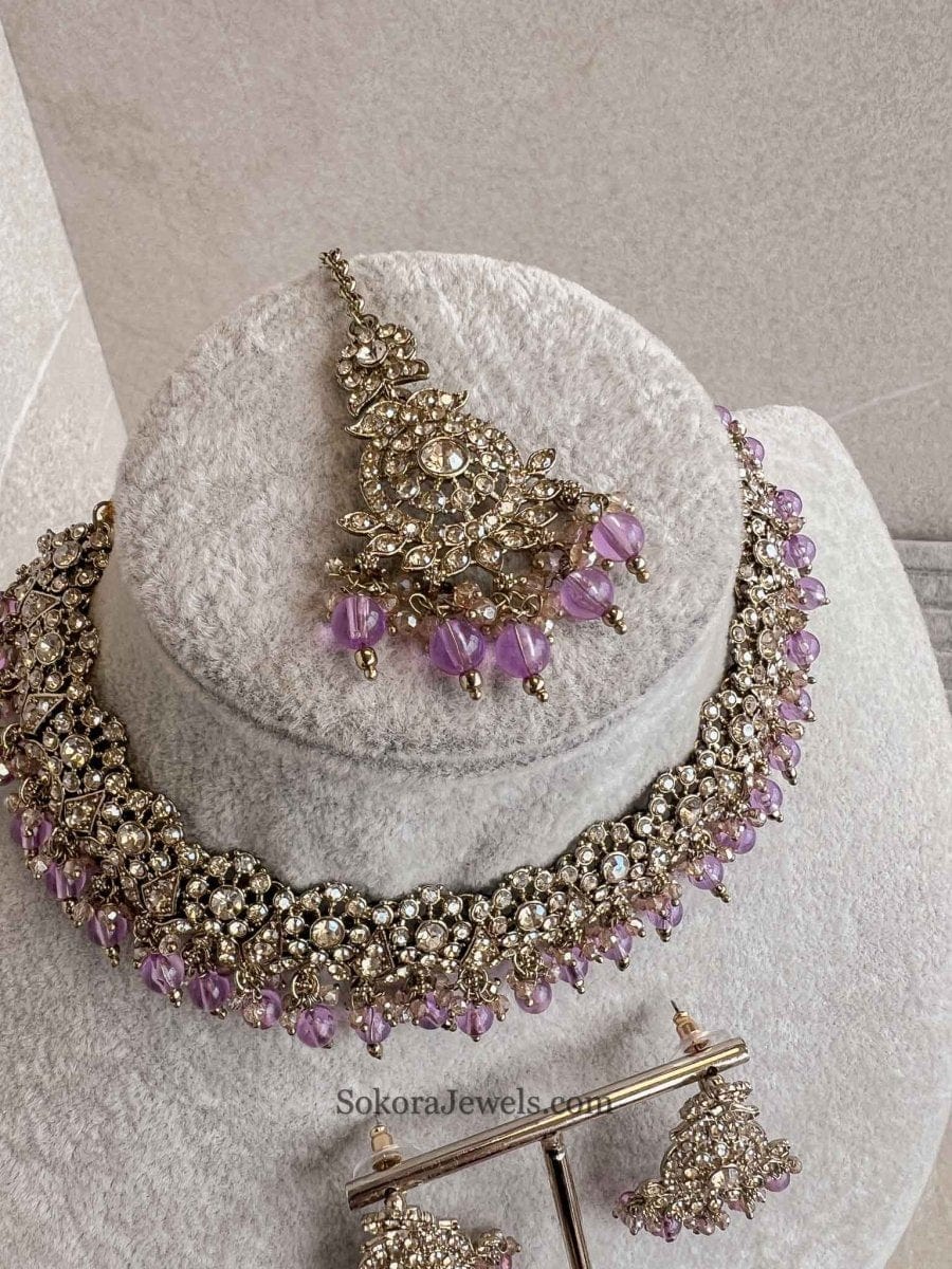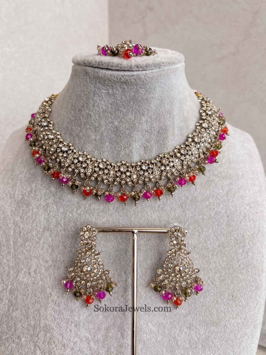 Pretty and Simple jewellery set that is no fuss and all Elegance!. Antique gold polish, sparkling golden crystals with colourful bead work. Comes with small matching tikka and earrings (2 inches)