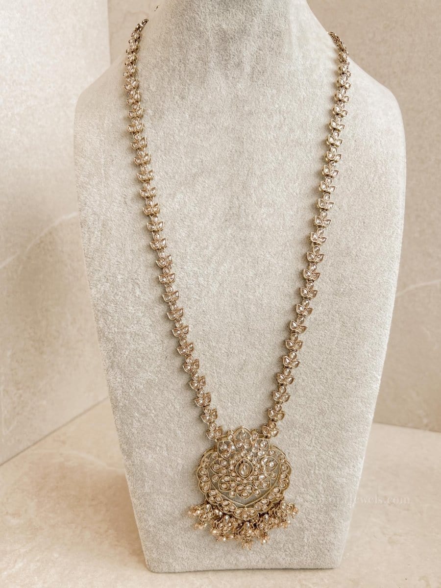 Antique gold Long Necklace with zircon crystals and colourful crystal beadwork. Matching items available. Search "Kavita" to view all matching items.