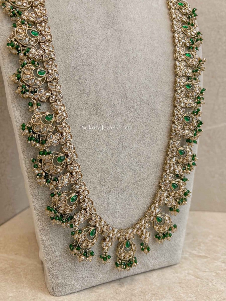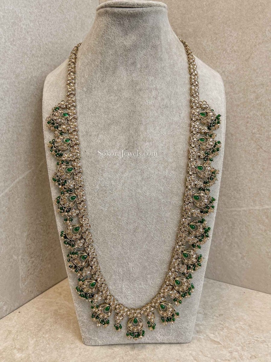 Antique gold Long Necklace with Golden zircon crystals, green and champagne beadwork. Matching items available.