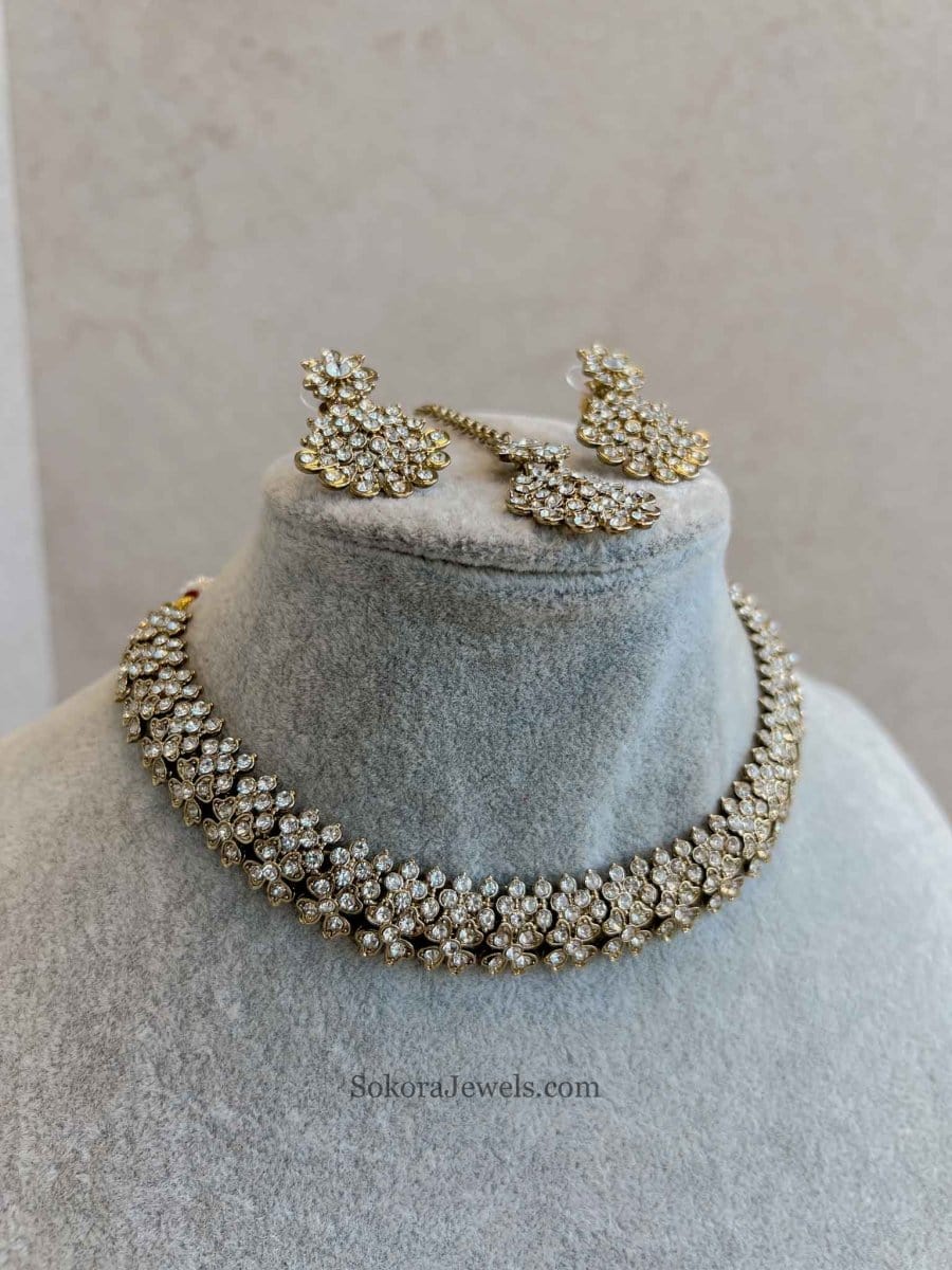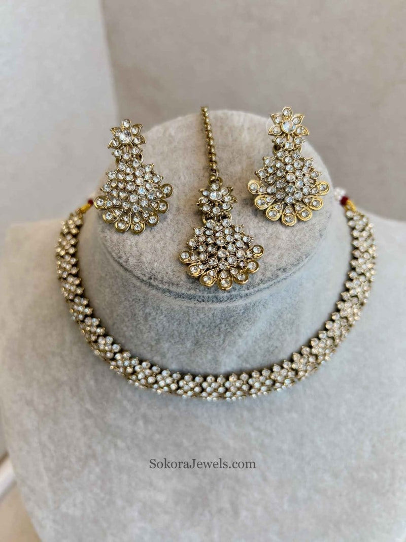 Necklaces adjustable to fit. Includes lightweight 2 inch length Earrings and tikka.