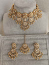 Necklace comes complete with matching tikka and statement jhumka earrings.