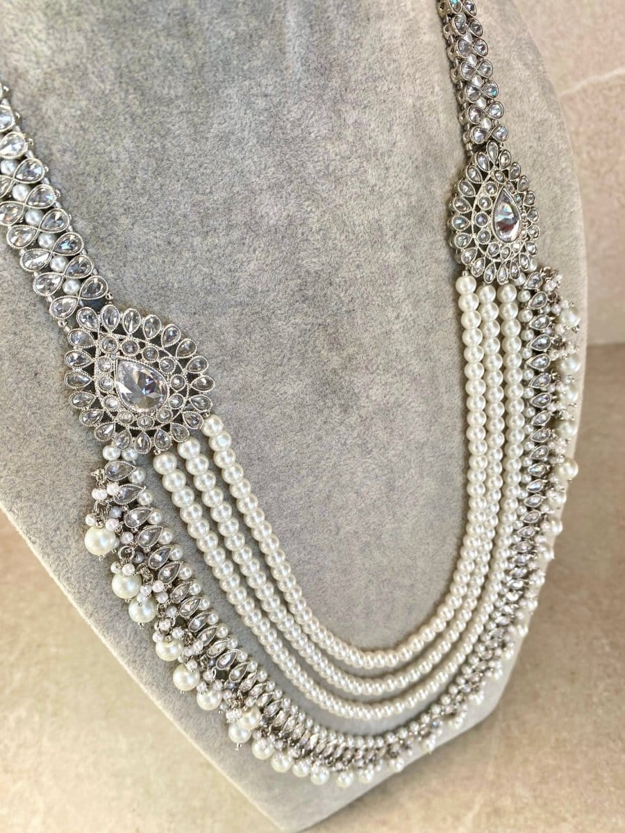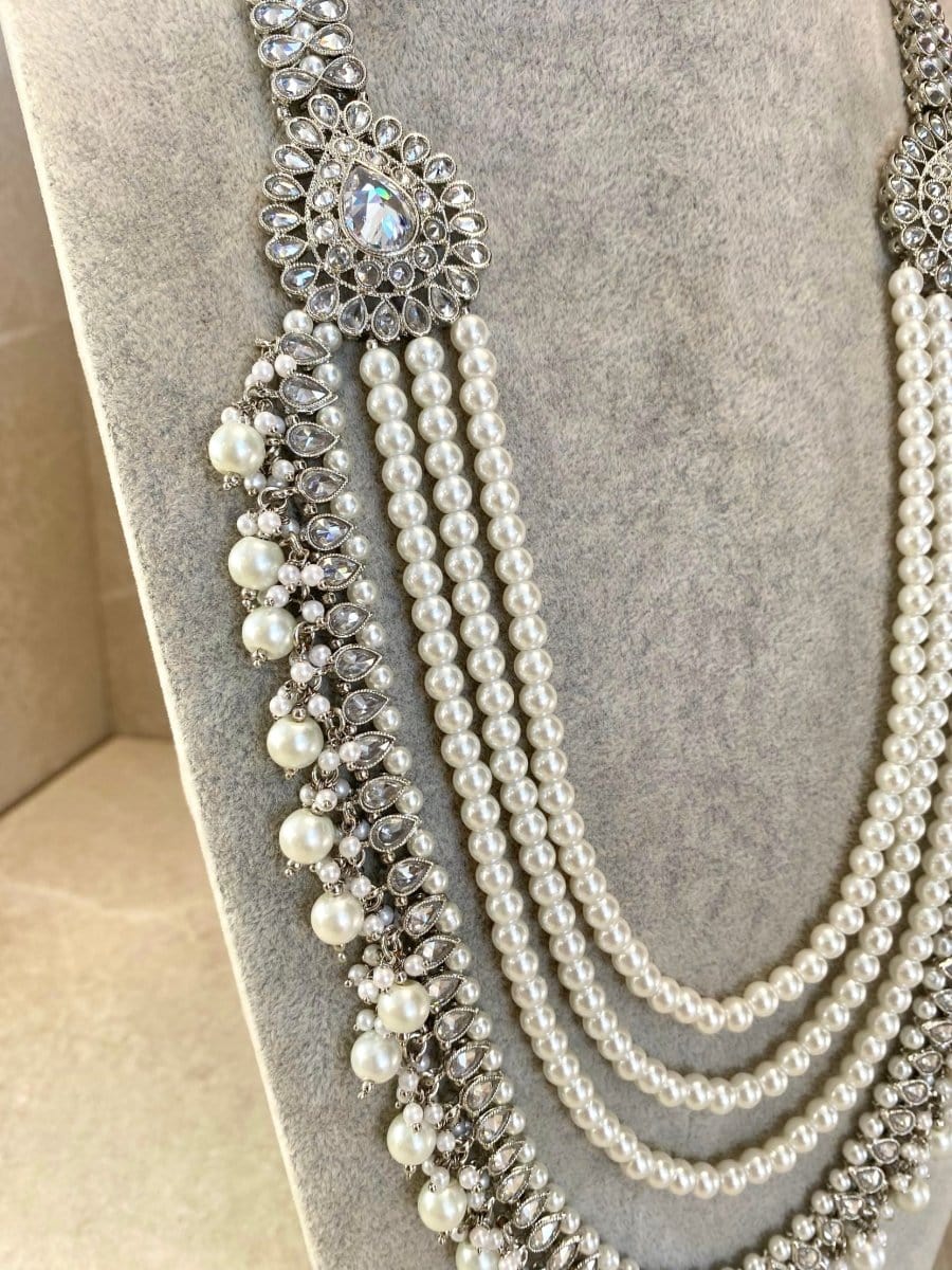 Clear zircon stones set on silver Long mala necklace with white pearl beads.