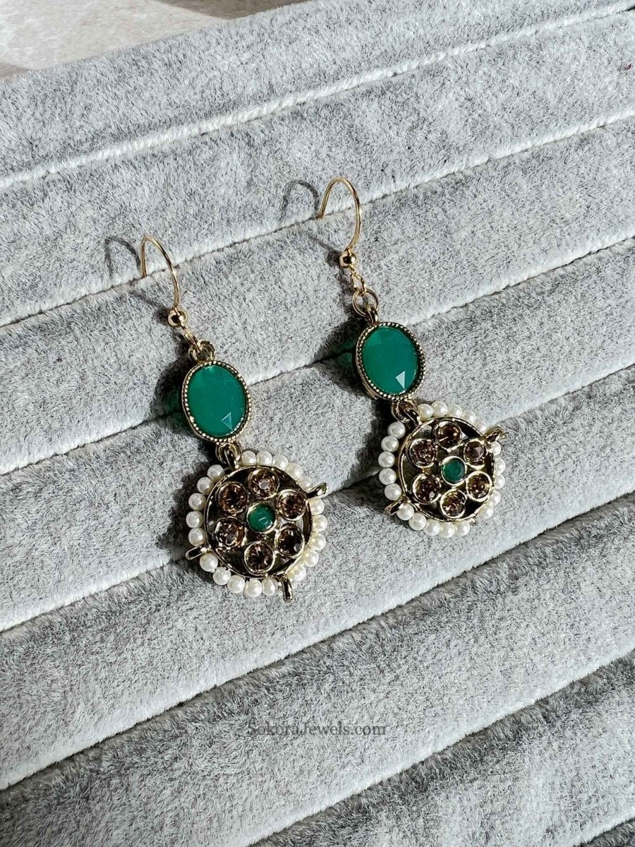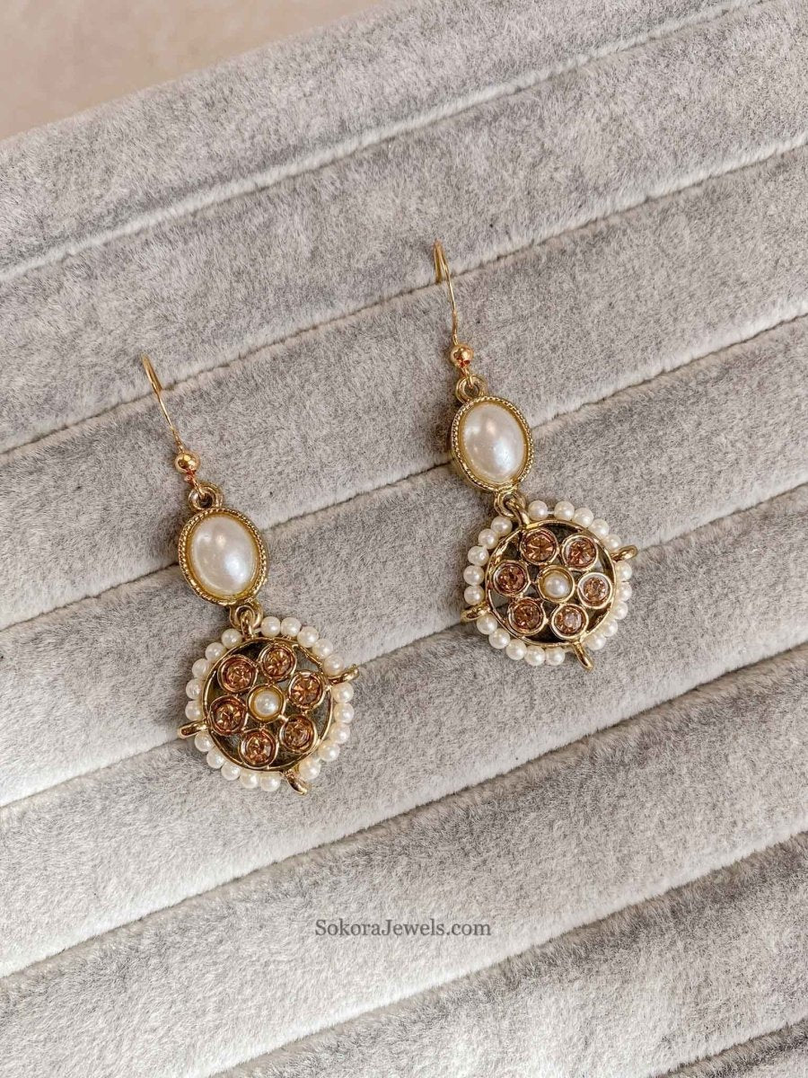 Antique gold earrings with pearl & golden stonework with coloured gems.