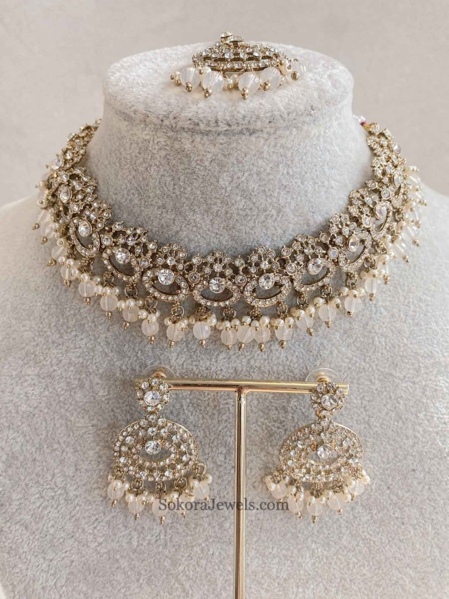 Pretty and Simple jewellery set that is no fuss and all Elegance!. Antique Gold polish,  sparkling clear crystals with pretty bead work.