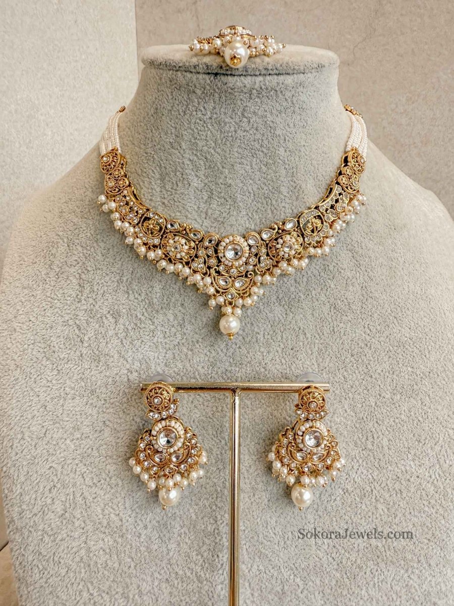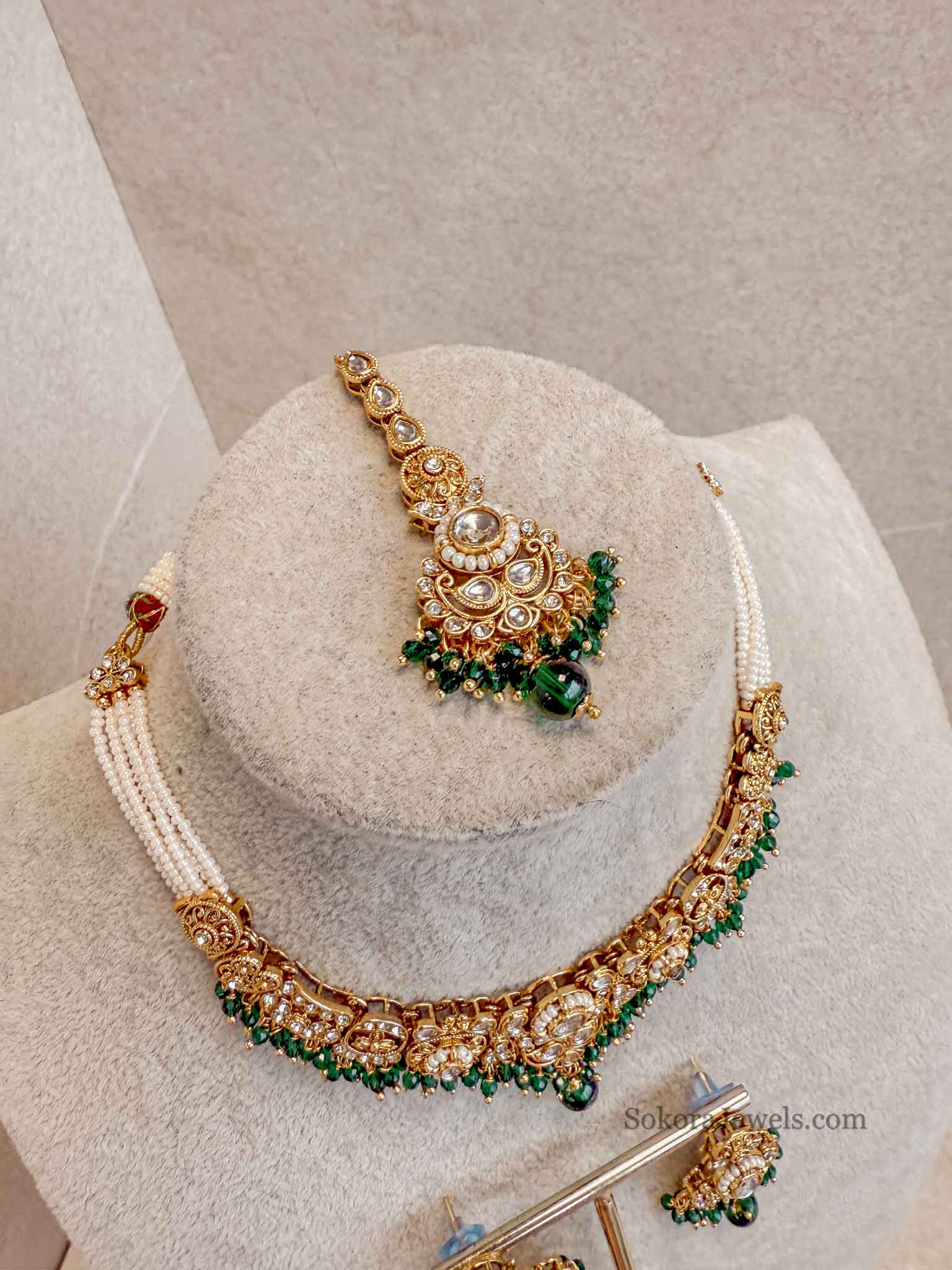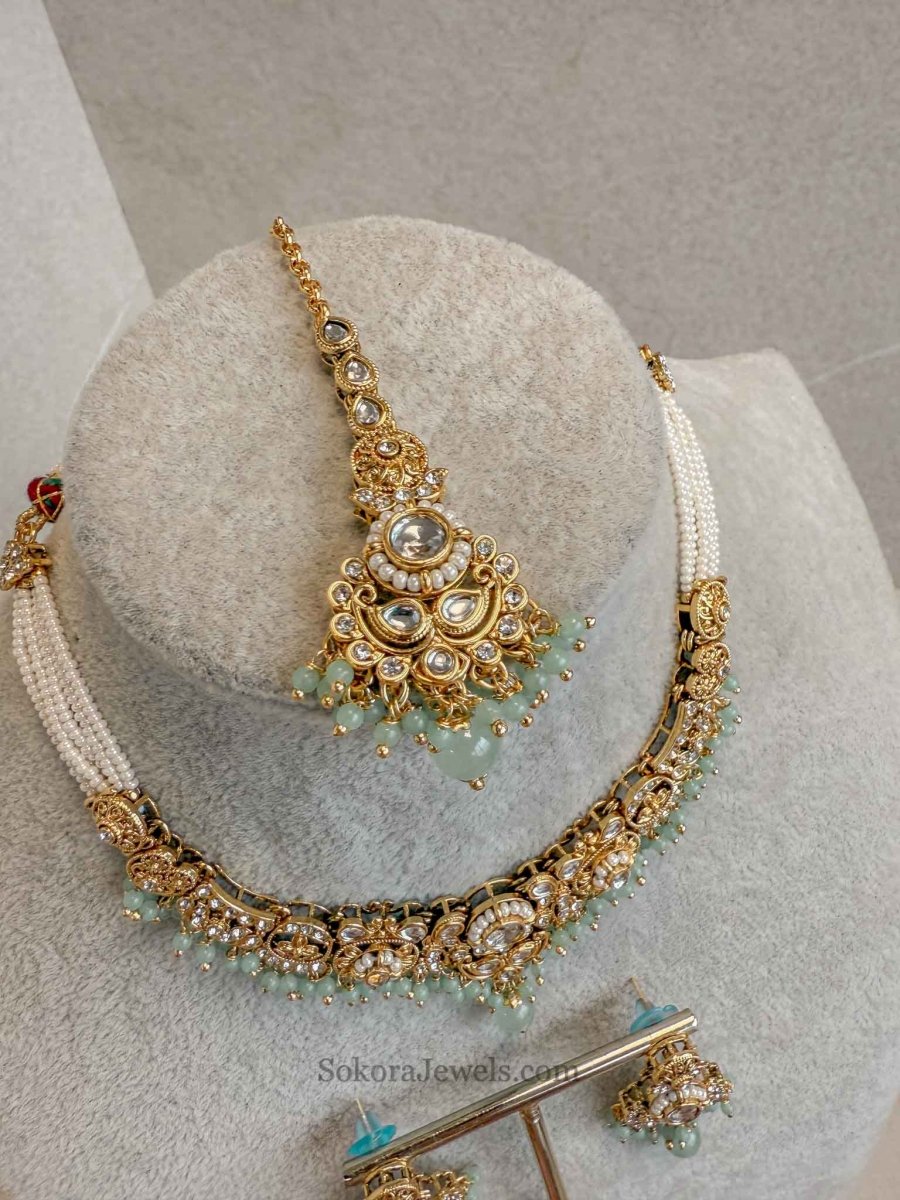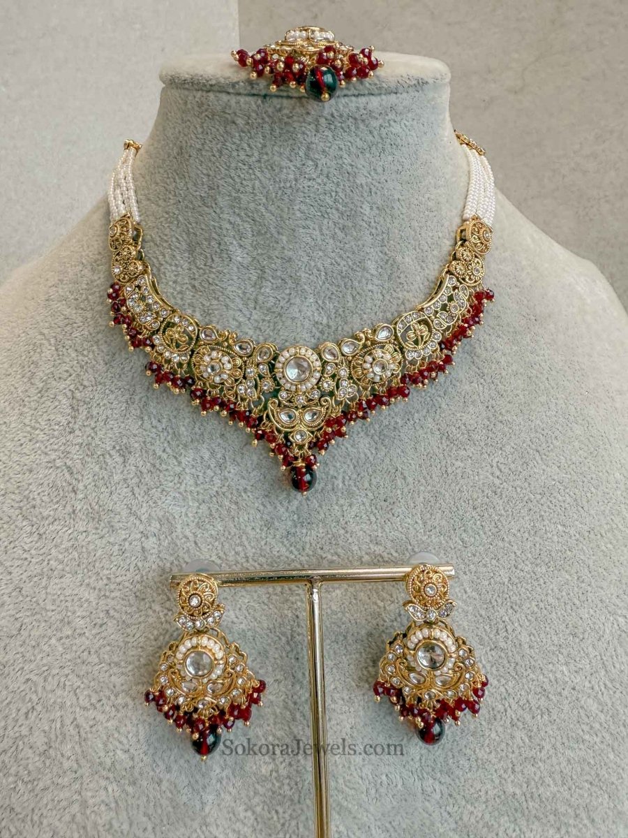 Simulated Kundan set on gold base with slight v shape and colourful beads.