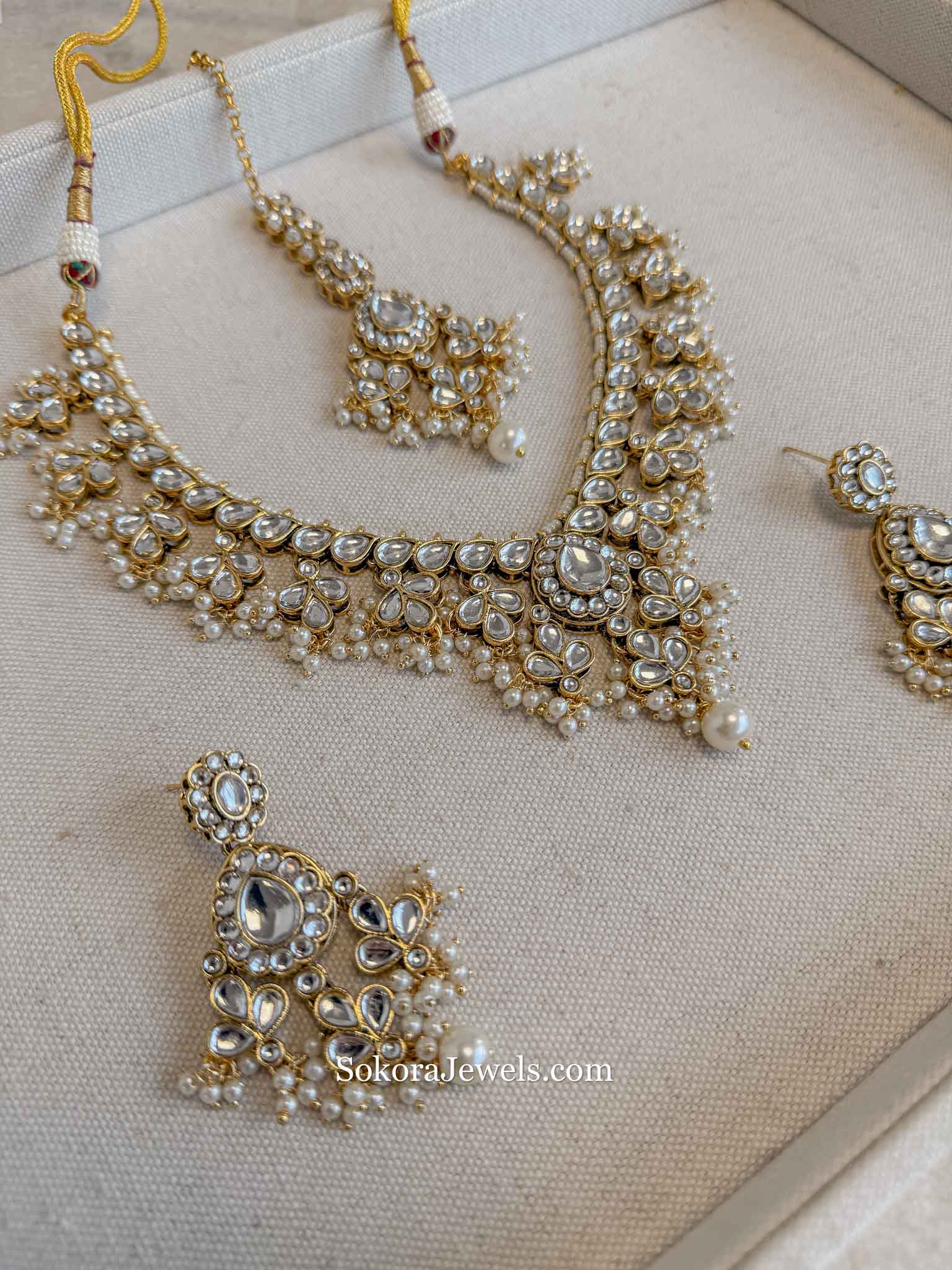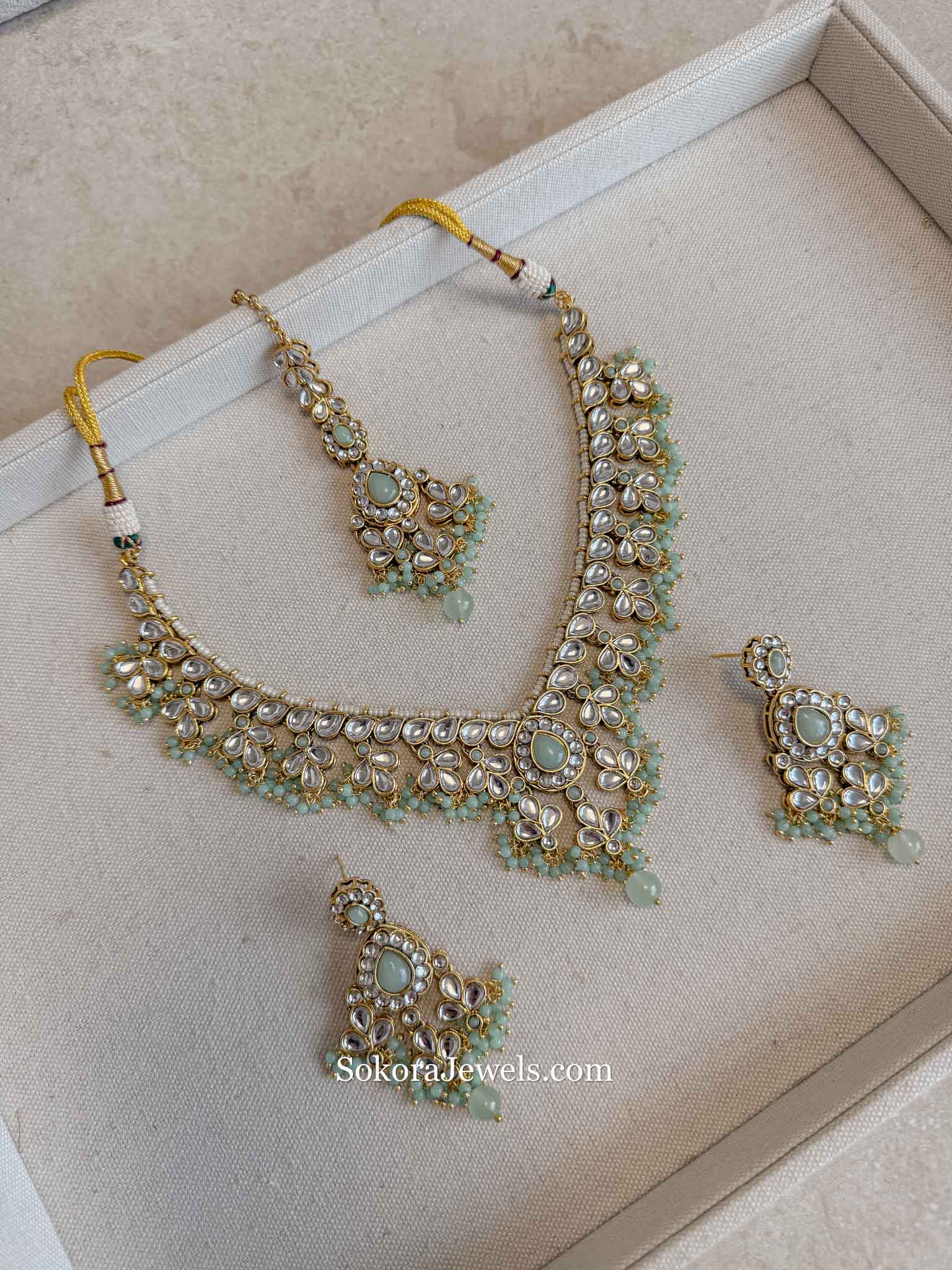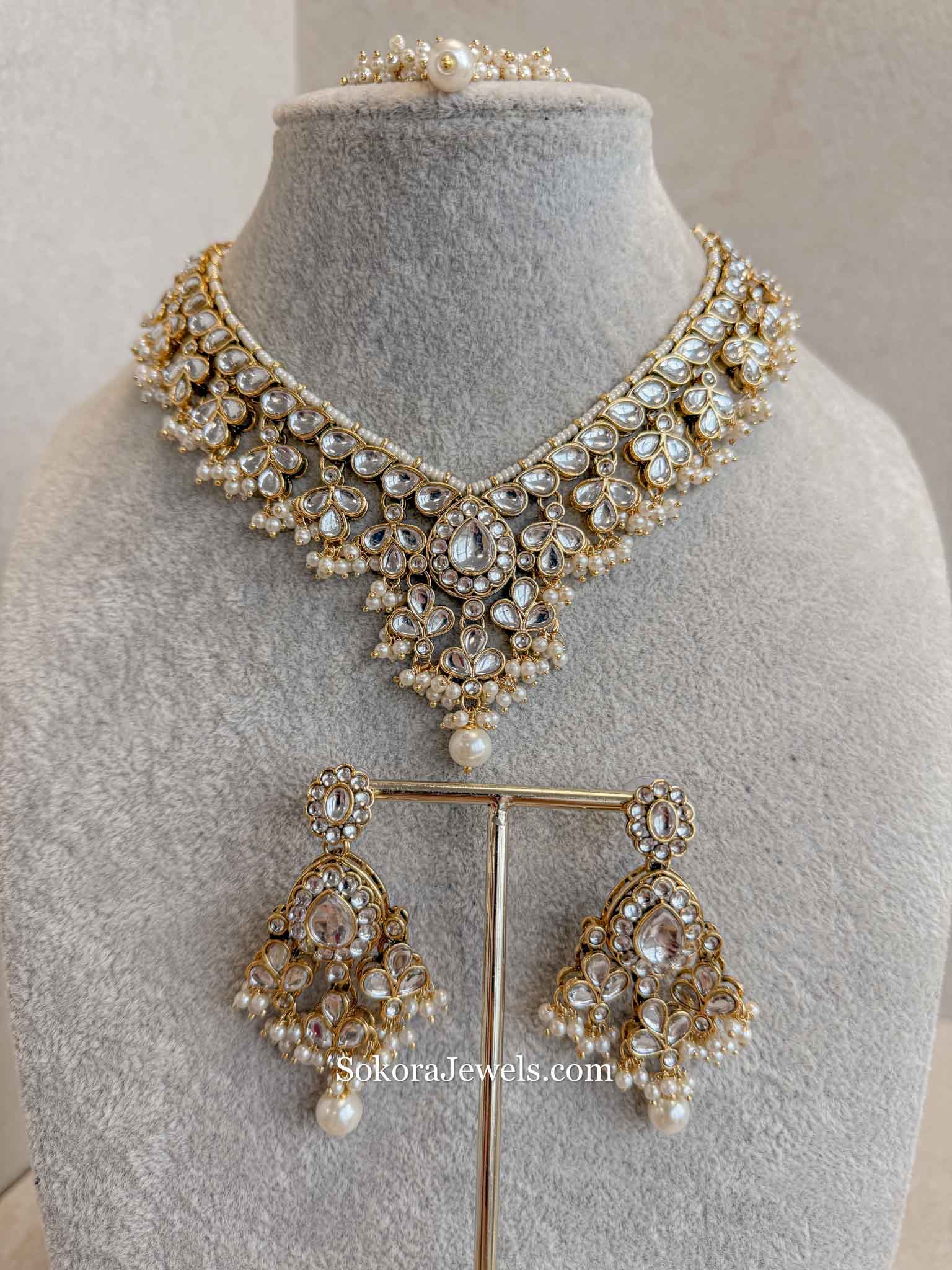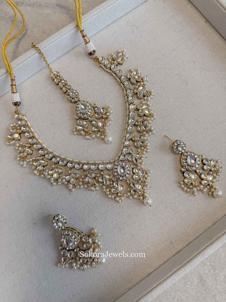 Simulated Kundan set on gold base with slight v shape and colourful beads.