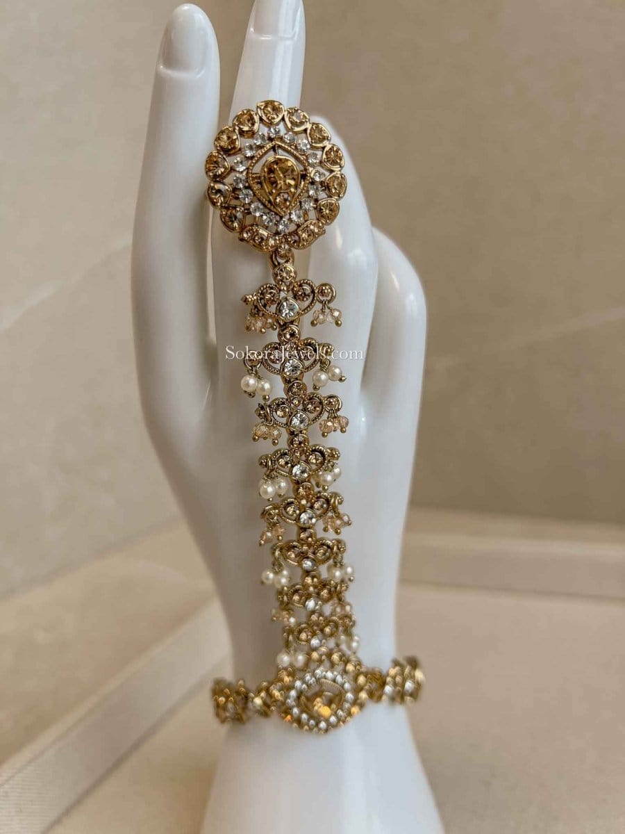 Please note reduced to clear items are exempt from exchange or return.Luxurious gold plated Bridal set made up of of champagne zircon crystals, hundreds of tiny pearls and green glass drop beads.