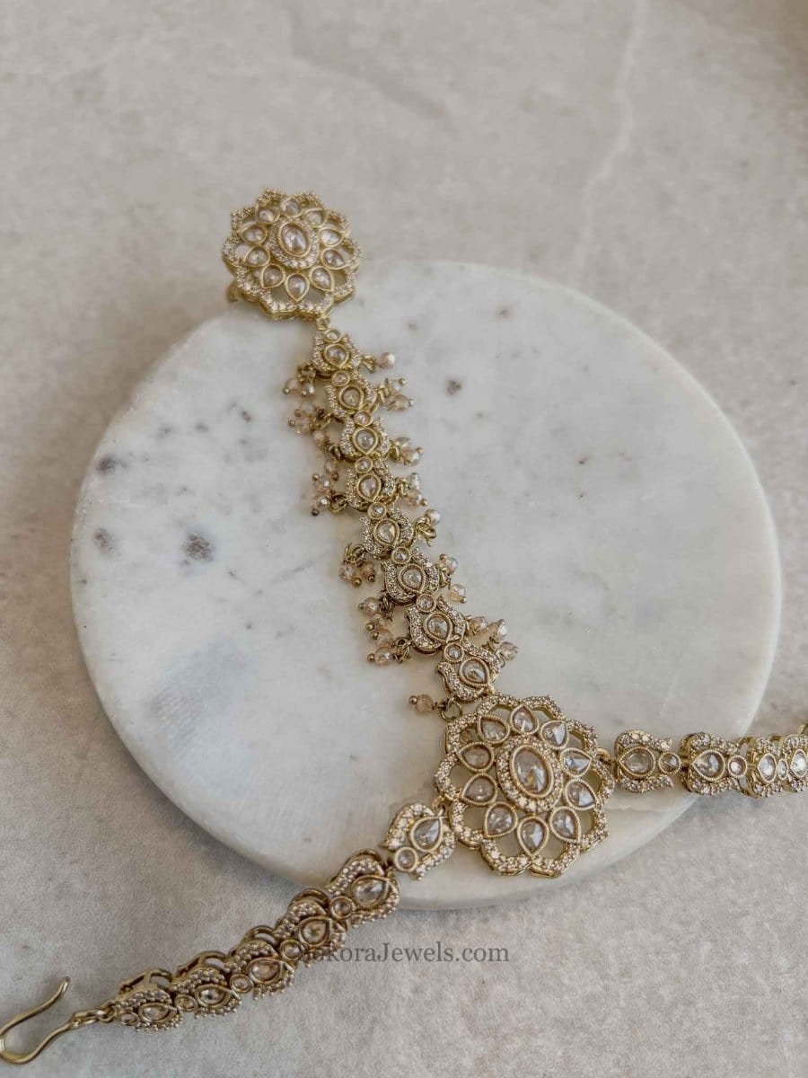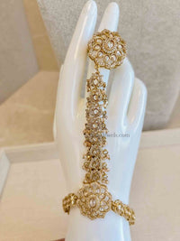 Antique gold hand harness with clear and golden zircon crystals finished with clusters of golden beads. Ring and wrist Size is adjustable to fit.