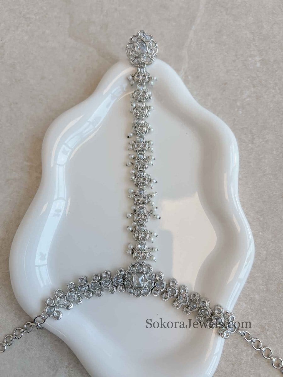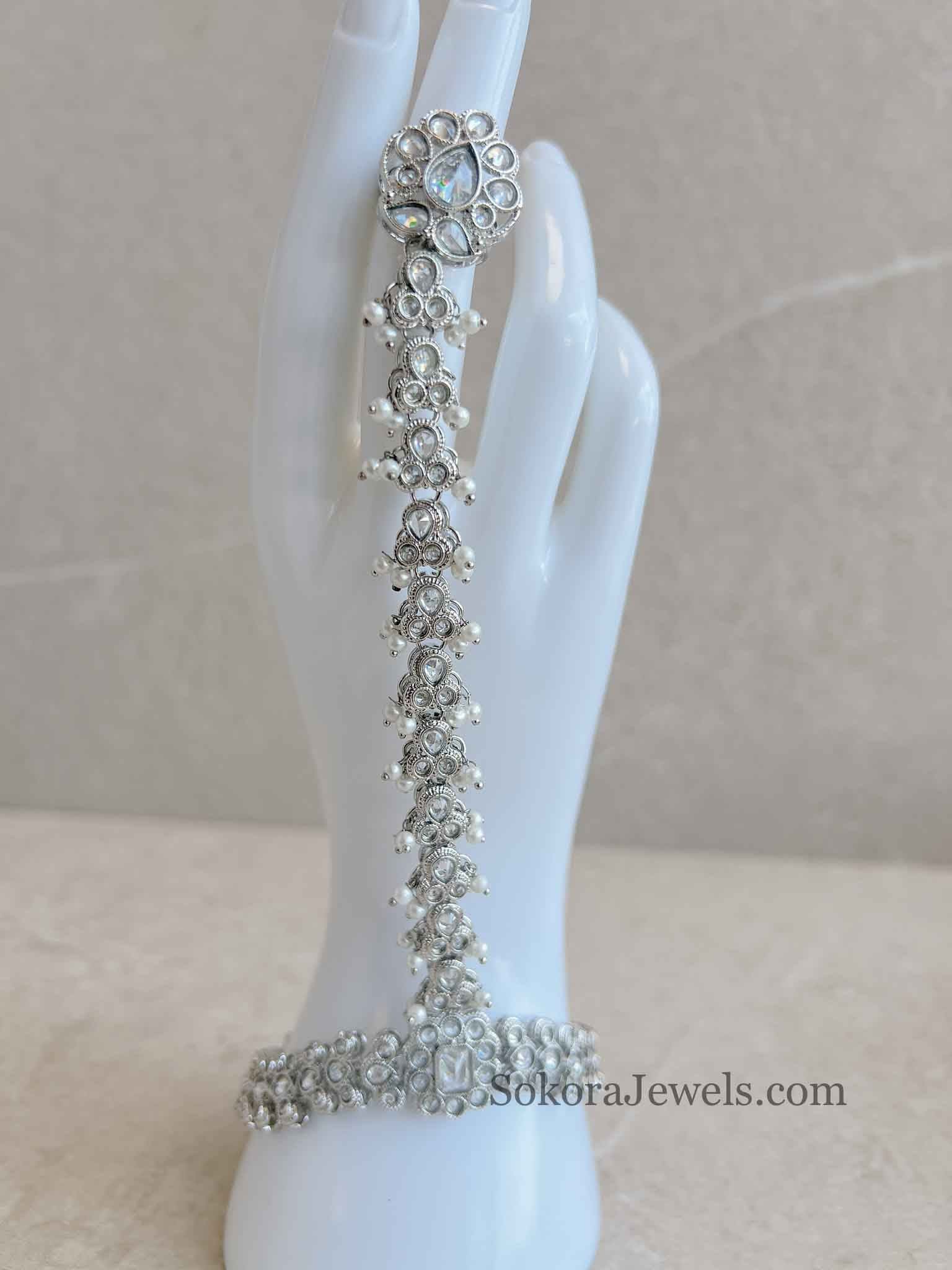 Silver and clear crystals on fluid Hand harness with white pearl beads.