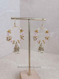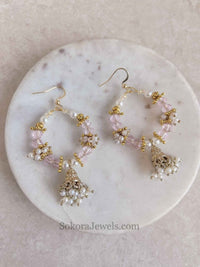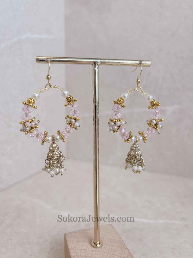 Gold Hoop earrings with faceted pink beads alongside small jhumka bell drops