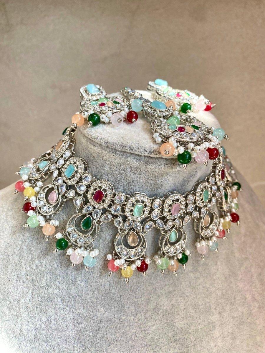 Flexible Silver necklace and earring set decorated with uncut zircon crystals and multicolour gems and beads.
