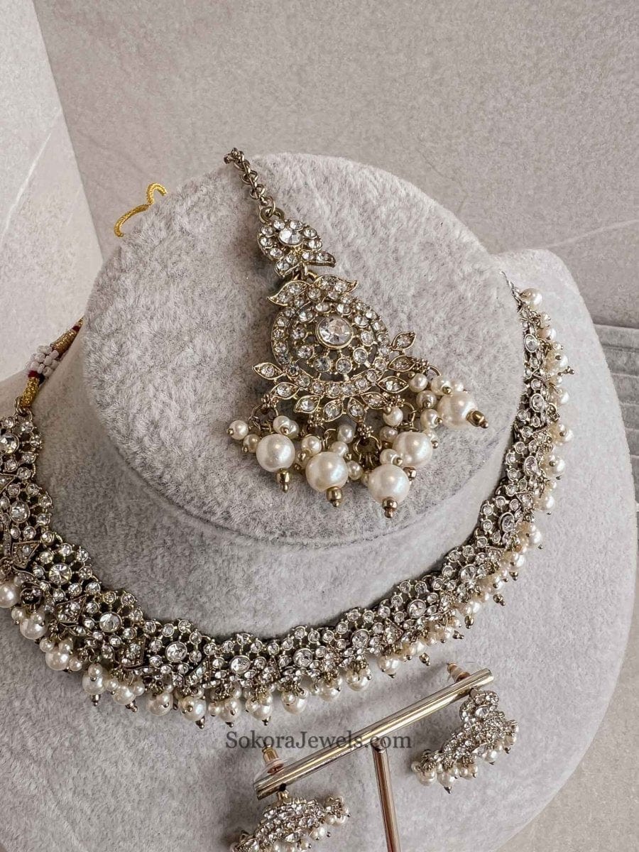 Pretty and Simple jewellery set that is no fuss and all Elegance!. Antique gold polish, sparkling clear crystals with colourful bead work. Comes with small matching tikka and earrings (2 inches)