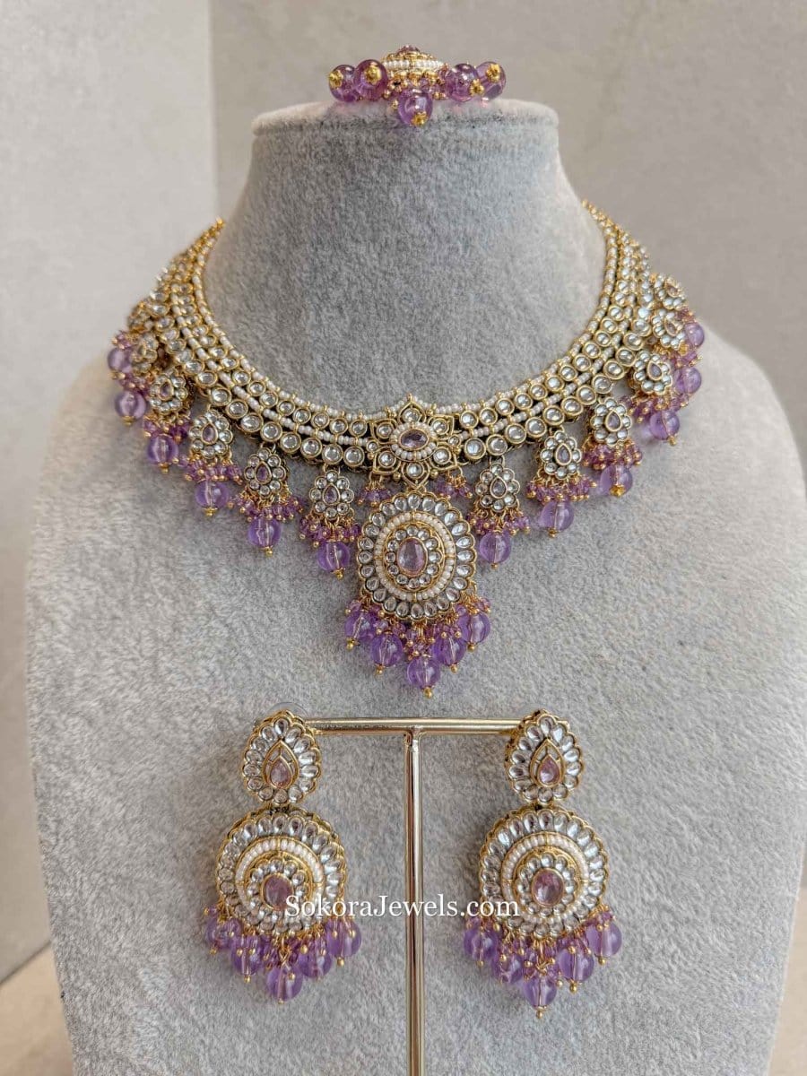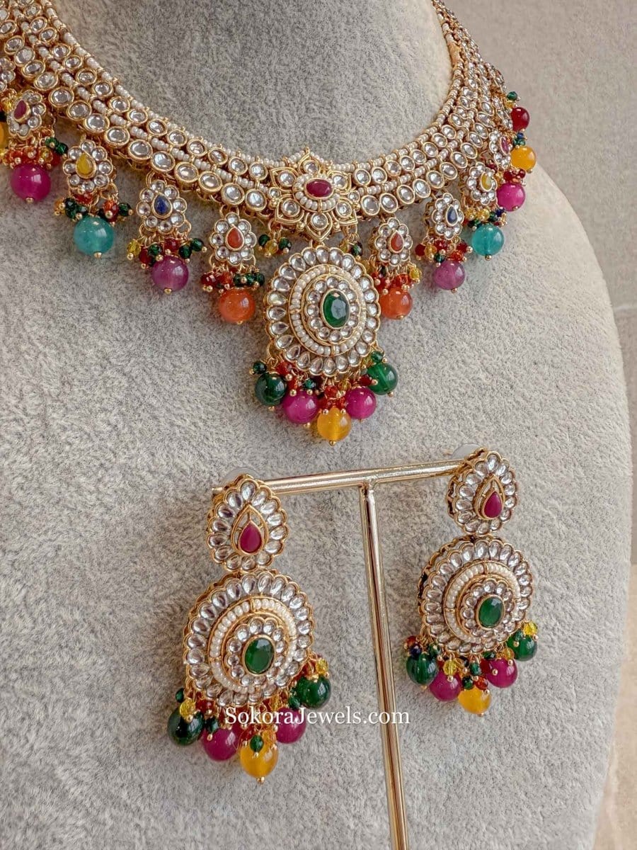 Gold Choker set with matching earrings and tikka. A light weight choker adorned with faux kundan gems and Colourful beadwork.