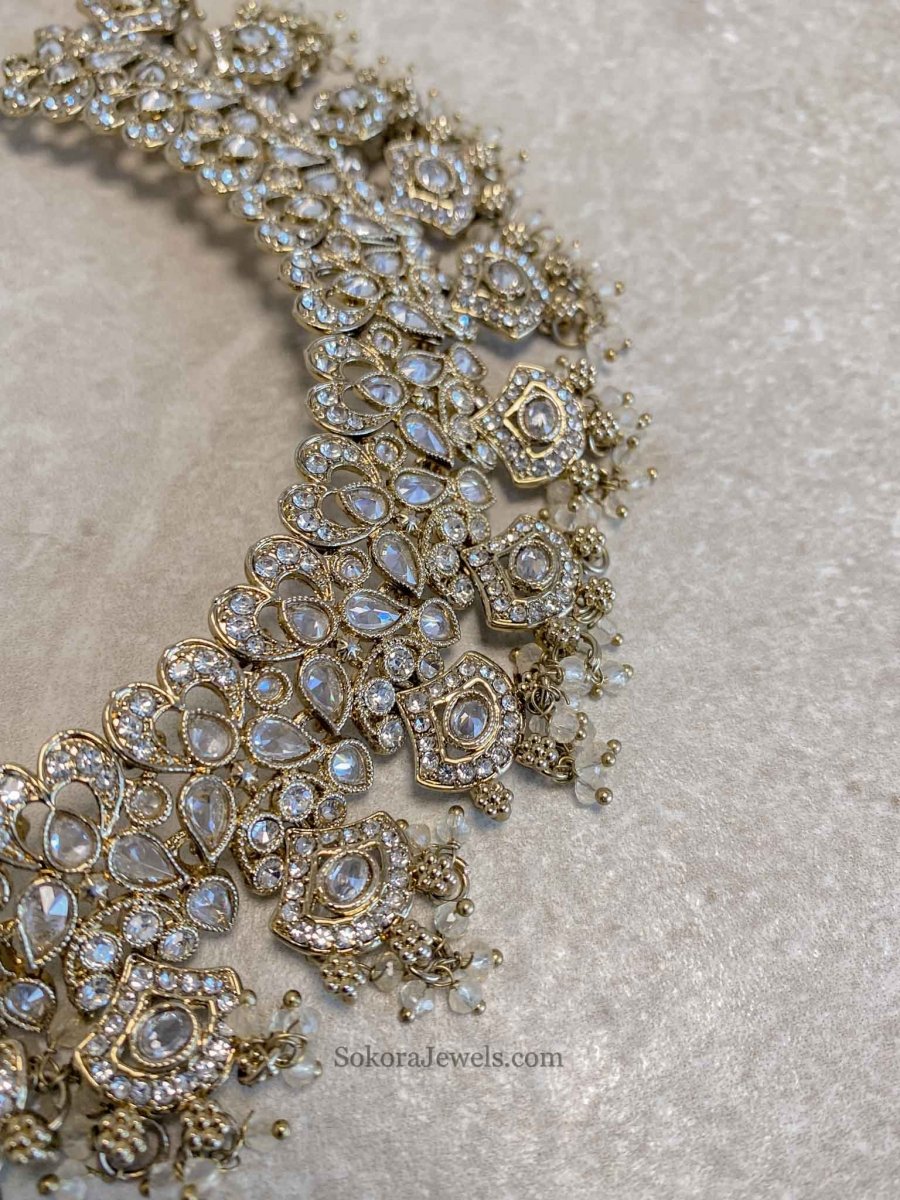 Intricate antique gold necklace set with intricate clear zircon and rhinestone gems. Finished with hundreds of shimmery colourful beads. Perfect for Indian/Pakistani/Bengali wedding guest or Bride