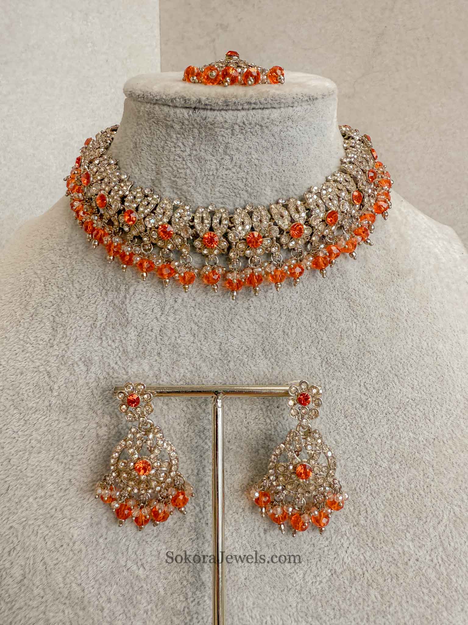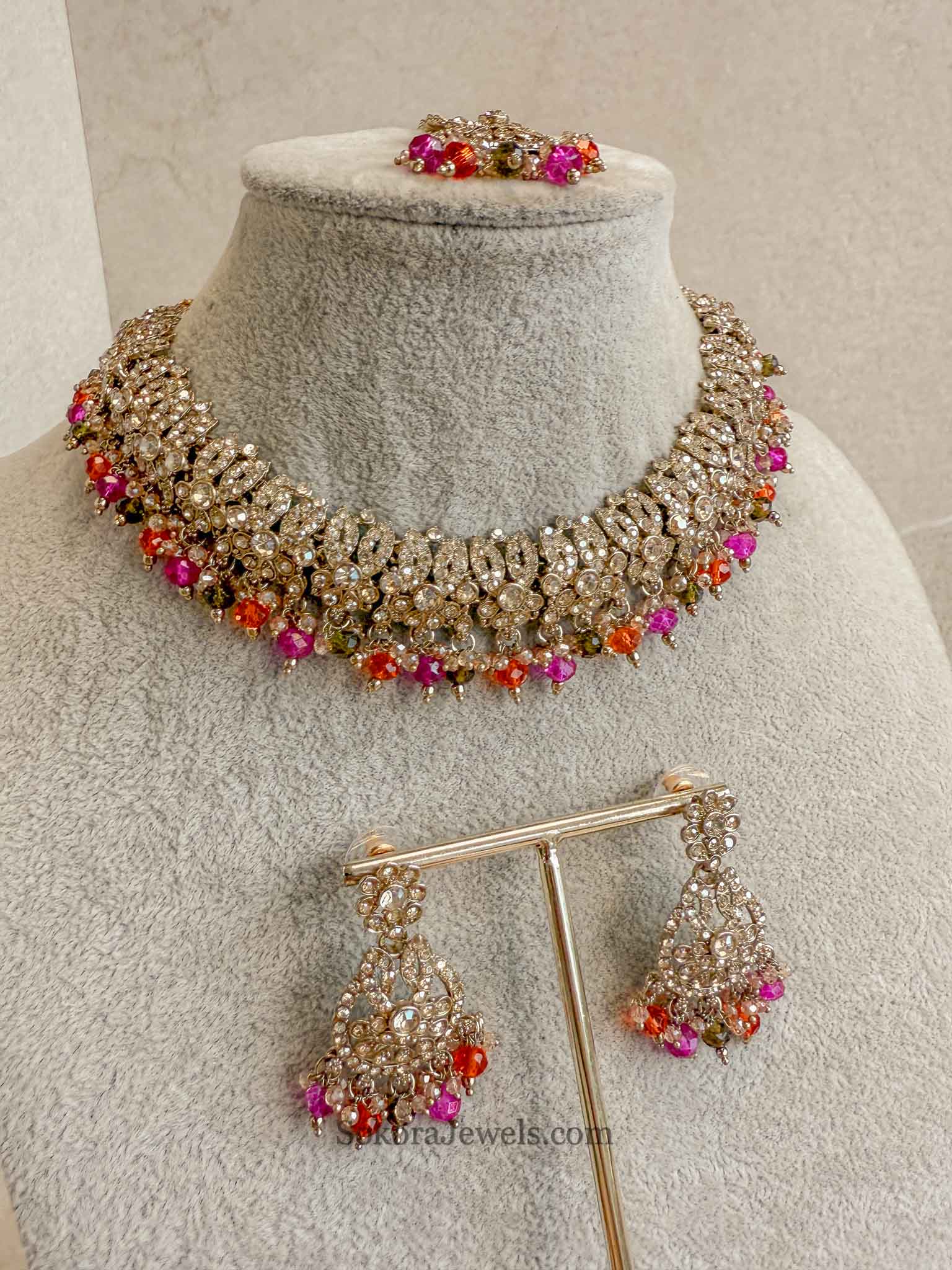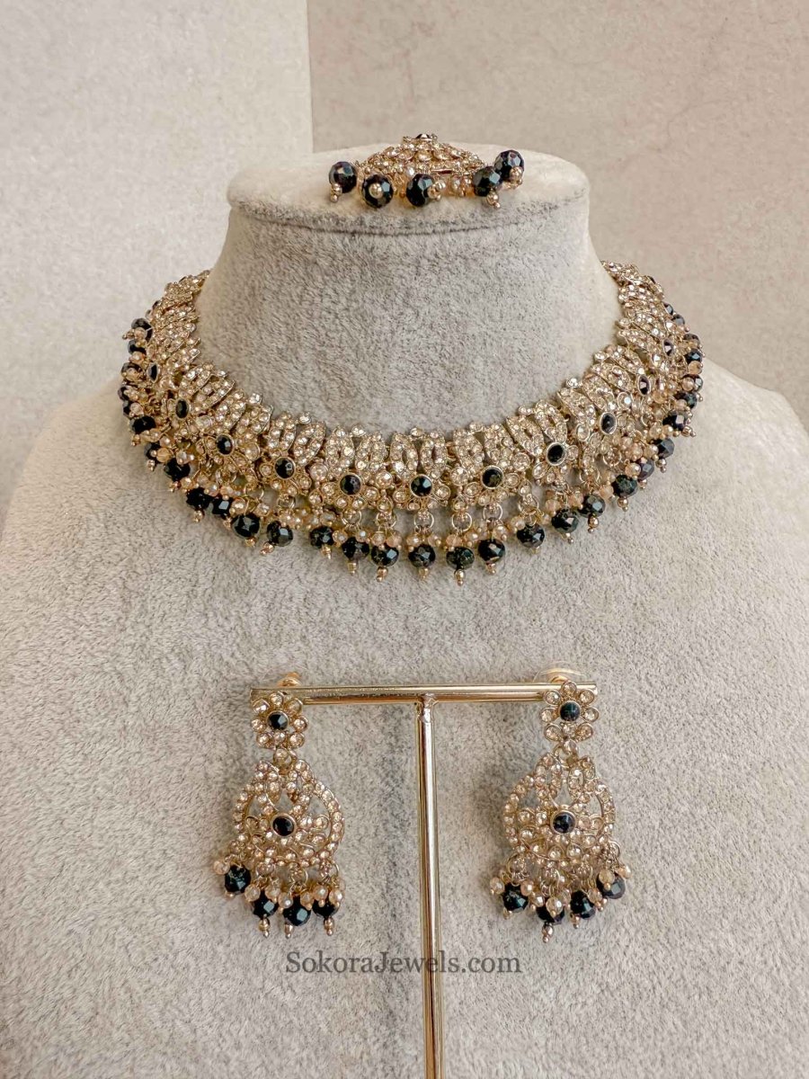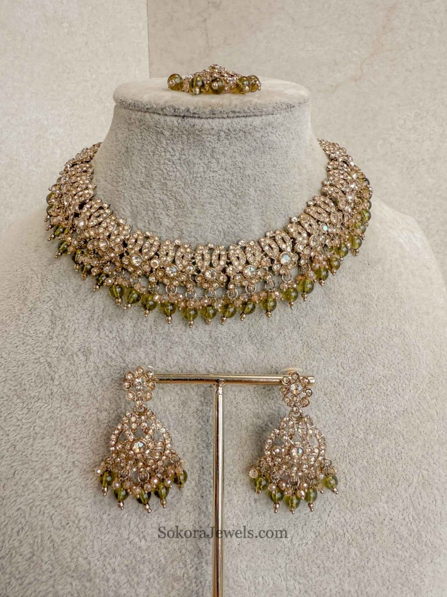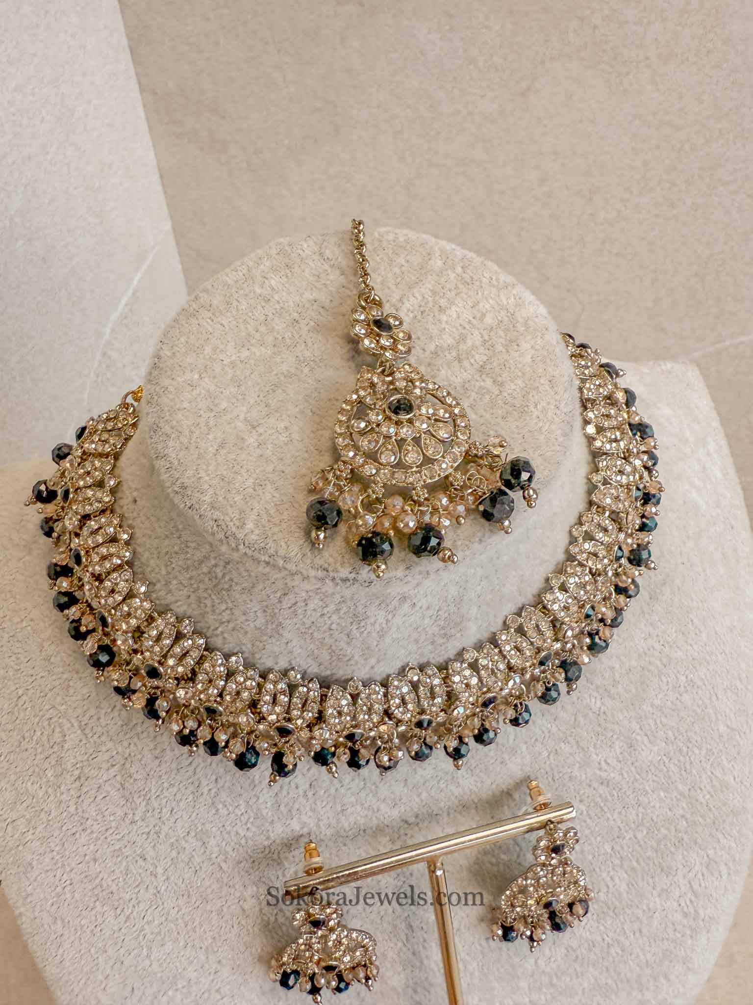 Pretty and Simple jewellery set that is no fuss and all Elegance!. Antique Gold polish, golden sparkling crystals with pearl bead work.