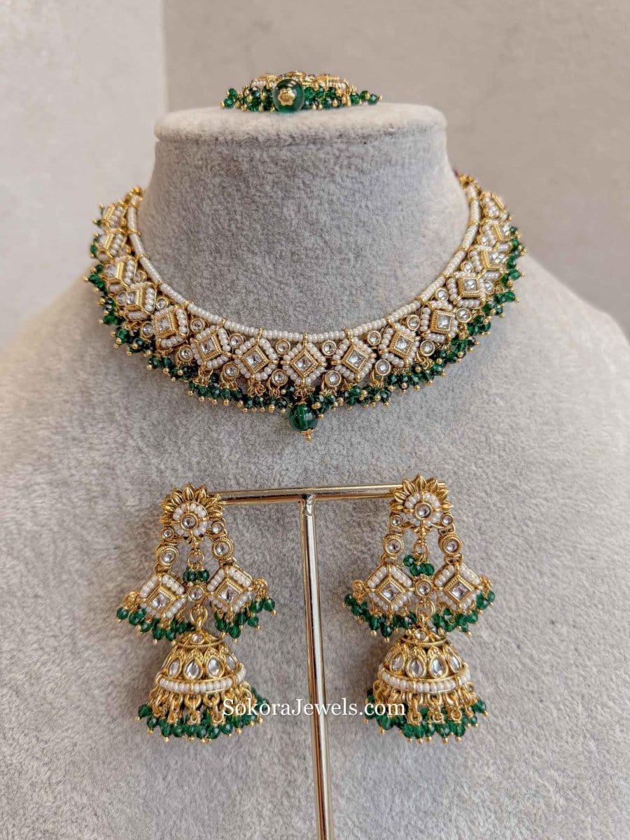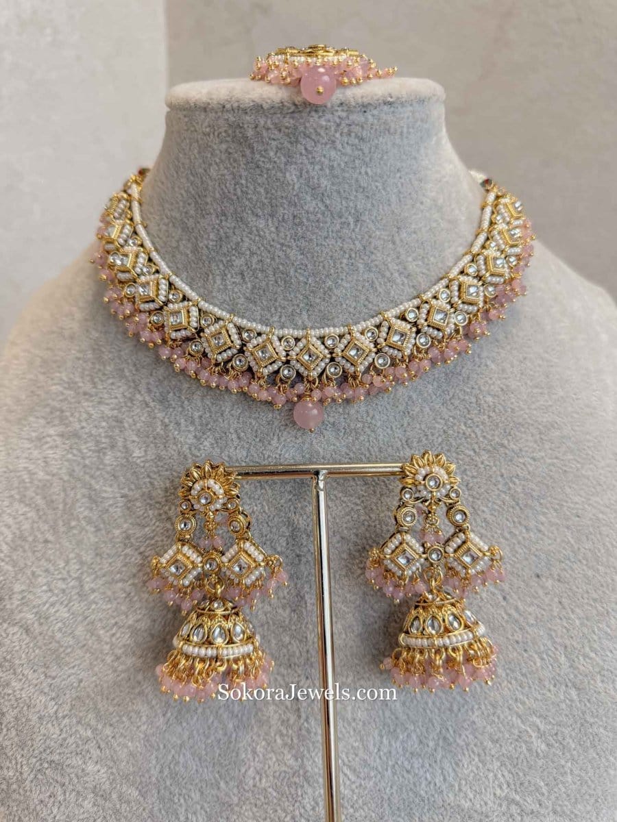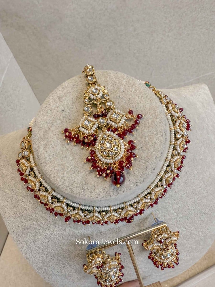 Slim and dainty Kundan set with colourful bead detailing with matching jhumka earrings and tikka.