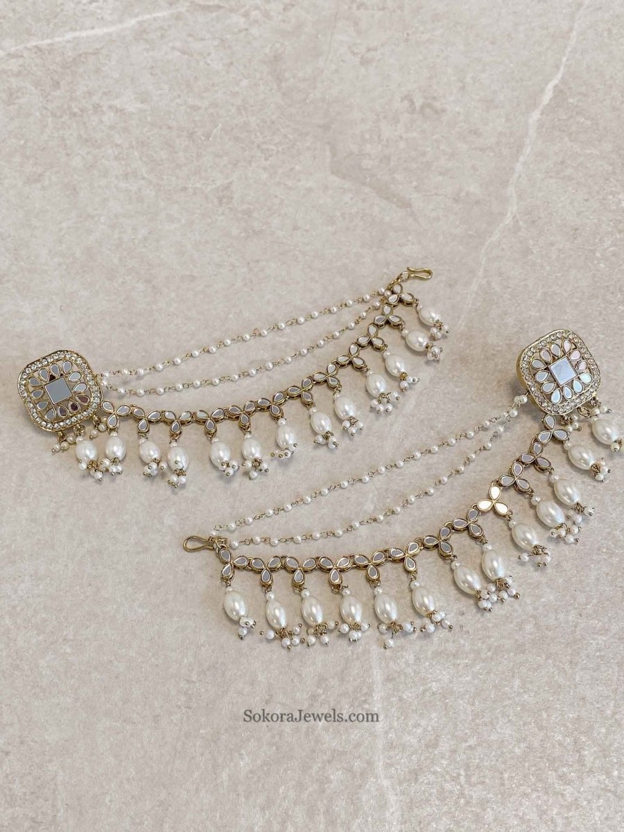 Large chained jhumke with glass mirrors and pearl bead work to hook into hair.