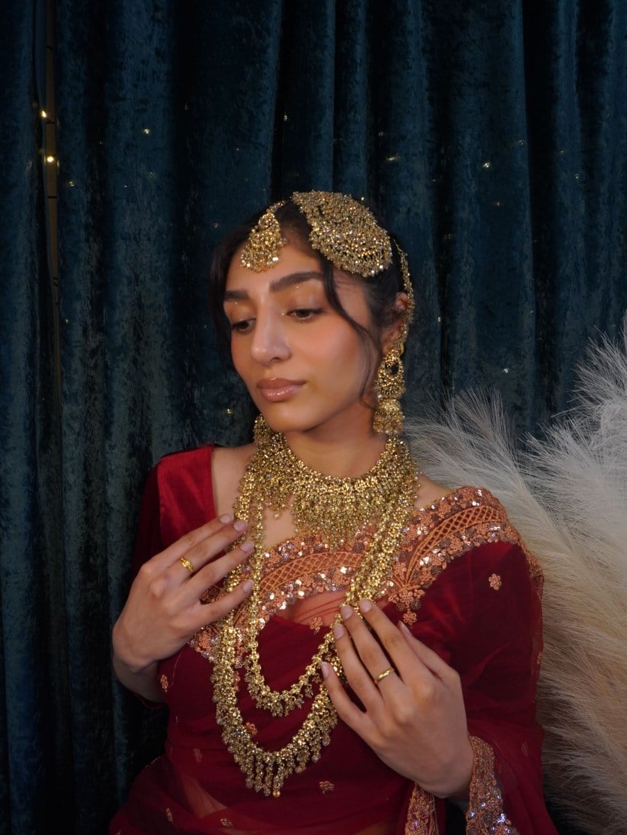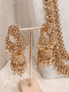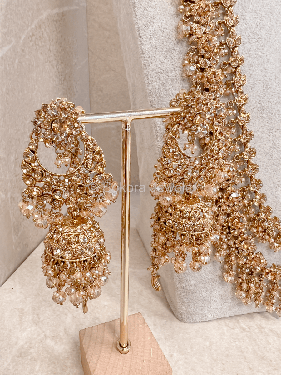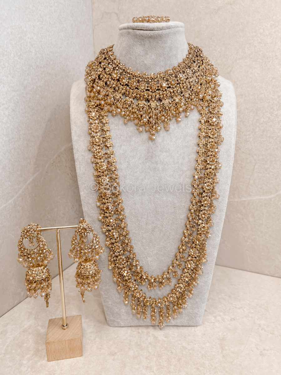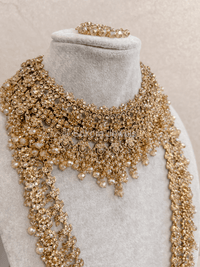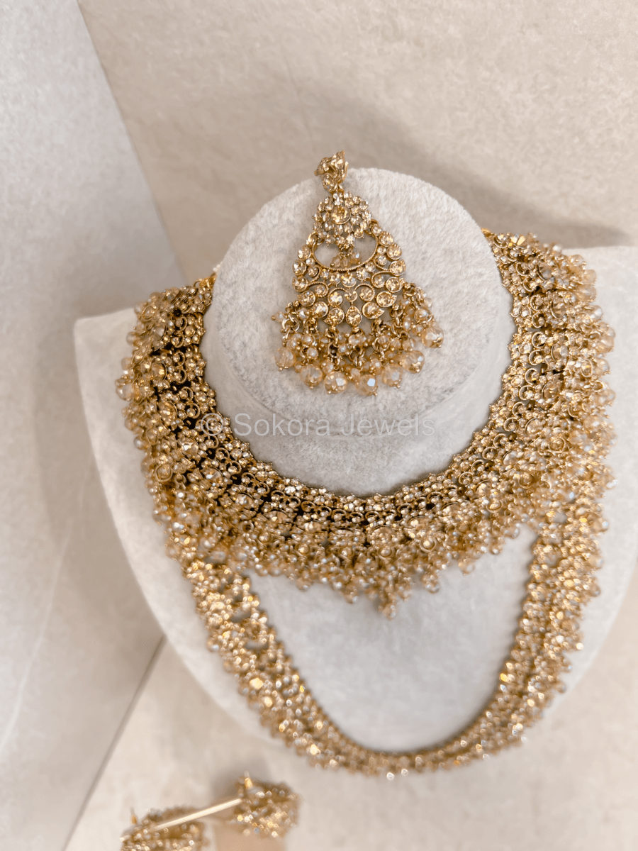 Antique gold necklace set with gold stonework and champagne faceted bead details. The set comes with matching earrings, tikka and long mala. Mala length can be adjusted by string to your preferred length.