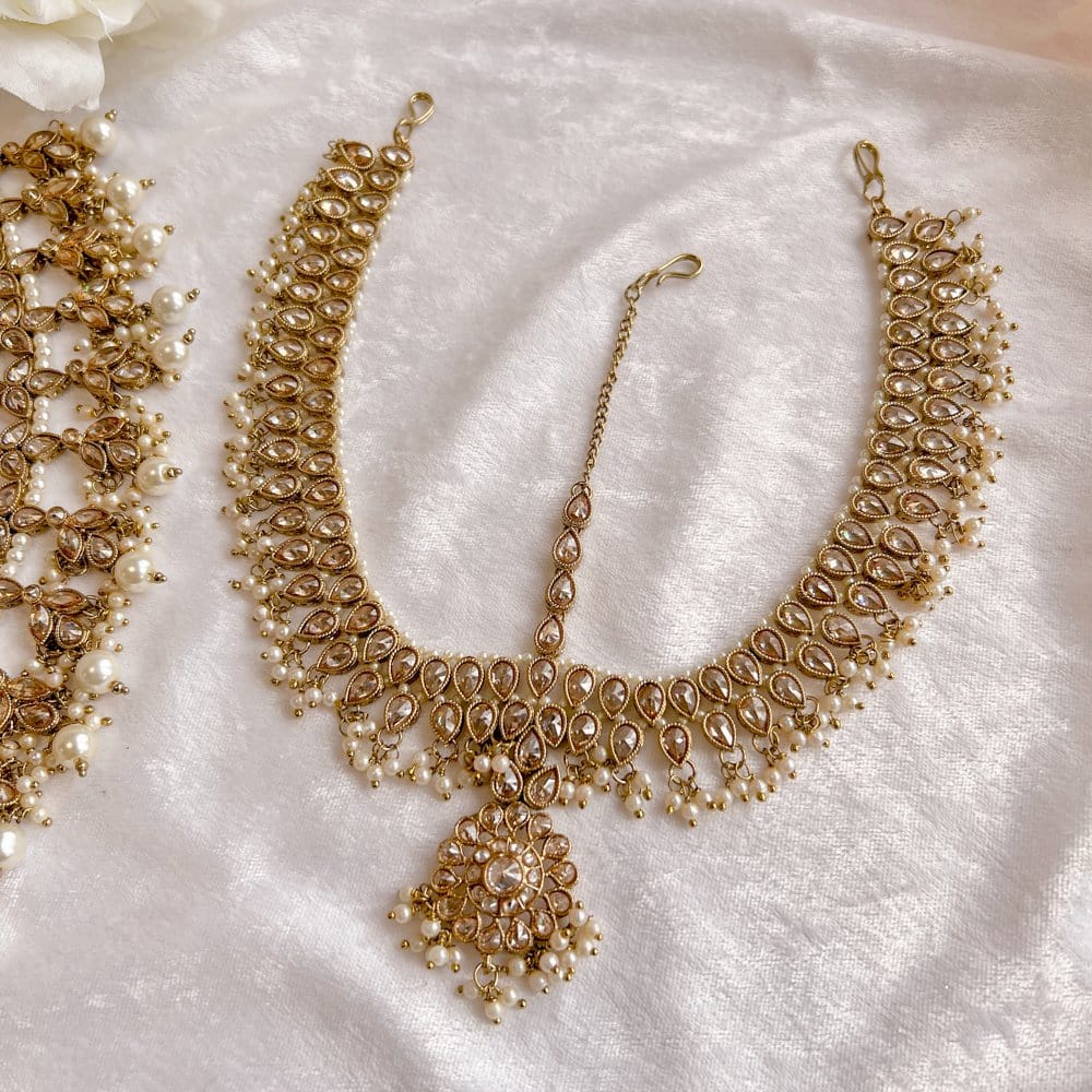 Luxury 9 ct gold plated bridal set with clear kundan stones and pearl beads.