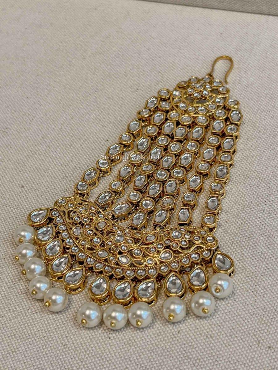 Gold plated Kundan Chandbali shaped tikka with pearl beads.