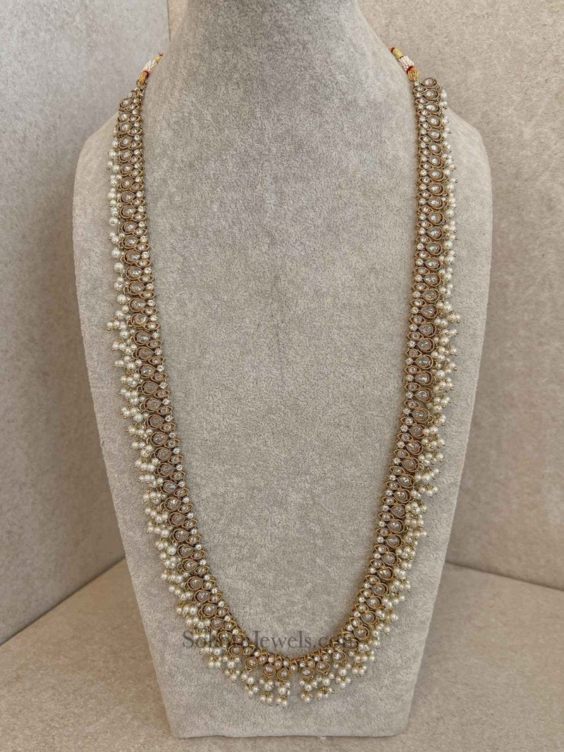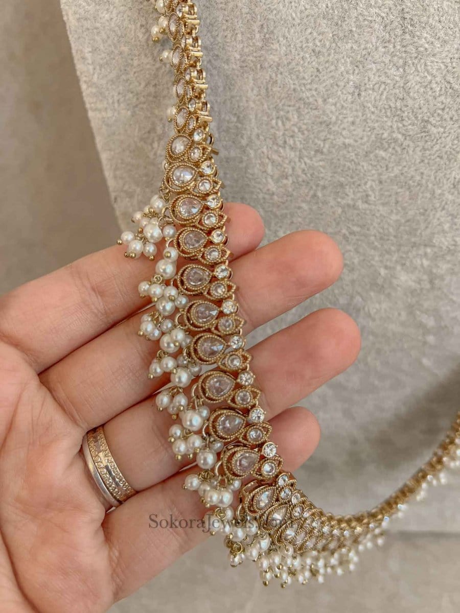 Clear zircon stones set on antique gold Long mala necklace with light pink and light blue beads.