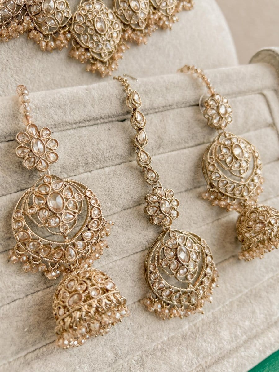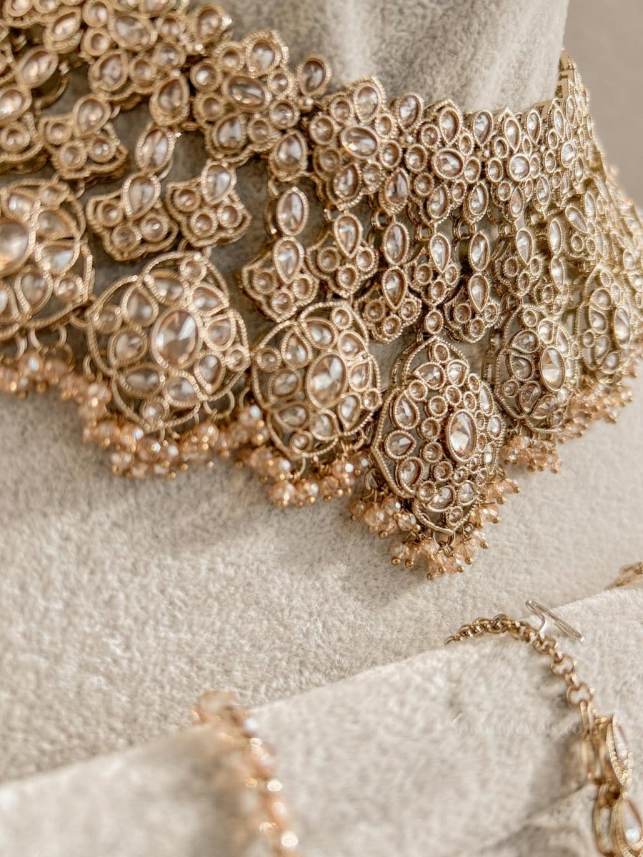 Flexible antique gold bridal necklace set made up of zircon crystals and colourful beads.