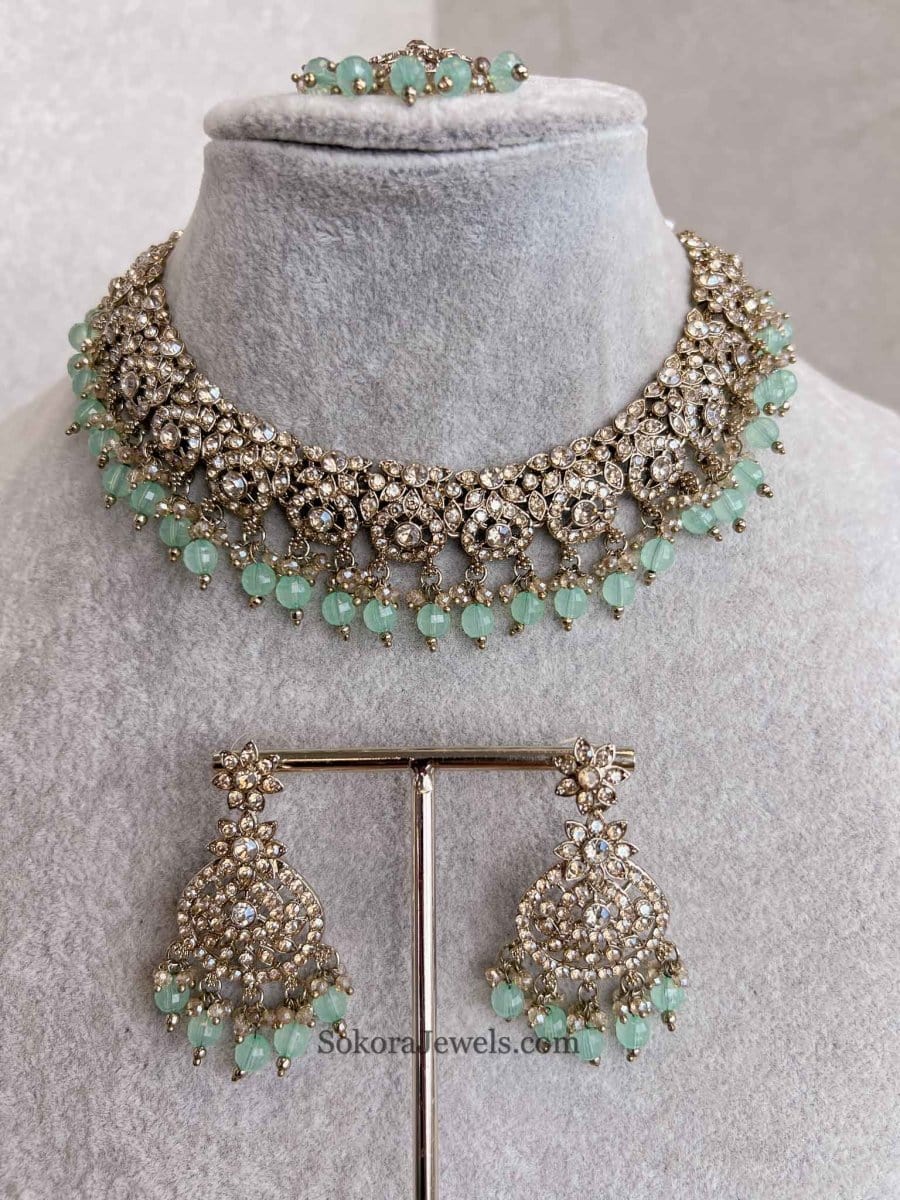 Pretty and Simple jewellery set that is no fuss and all Elegance!. Antique gold polish, sparkling golden crystals with colourful bead work. Comes with small matching tikka and earrings (2 inches)