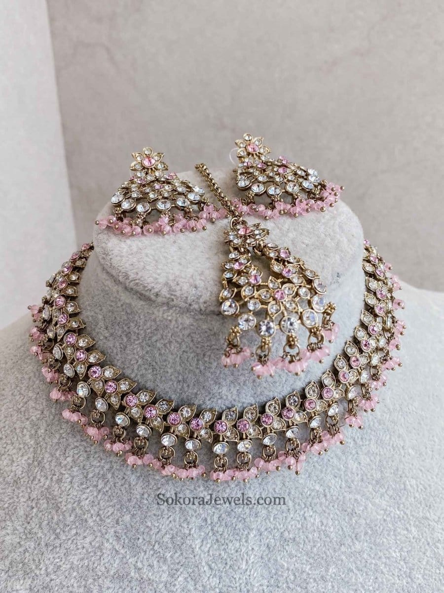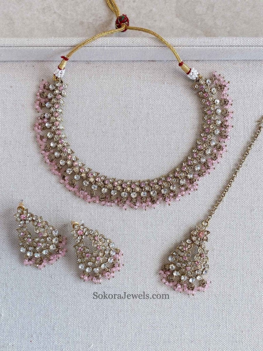 Pretty and Simple jewellery set that is no fuss and all Elegance!. Antique Gold polish and clear crystals with colourful bead work. Comes with small matching tikka and earrings (2 inches)
