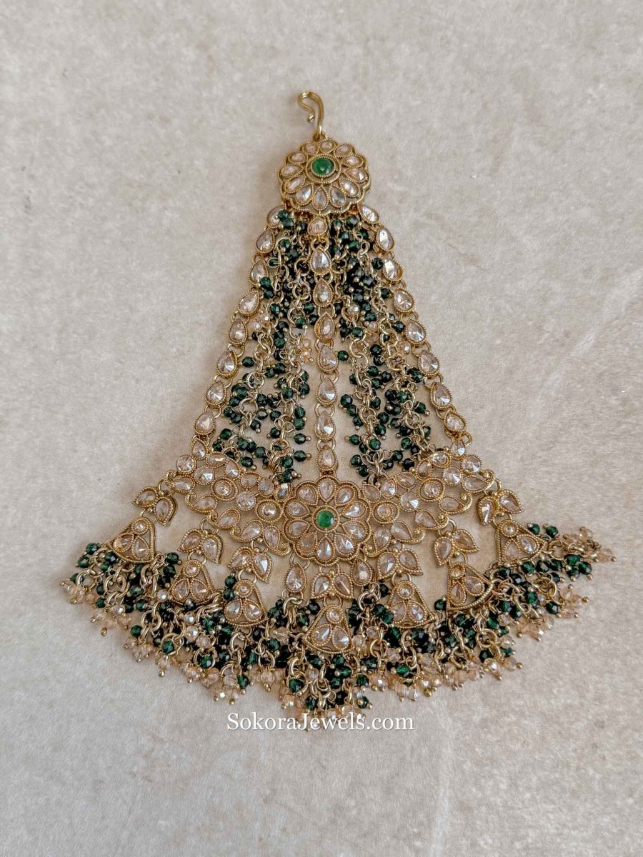 Antique Gold jhumar with champagne zircon crystals finished with green & champagne beads.