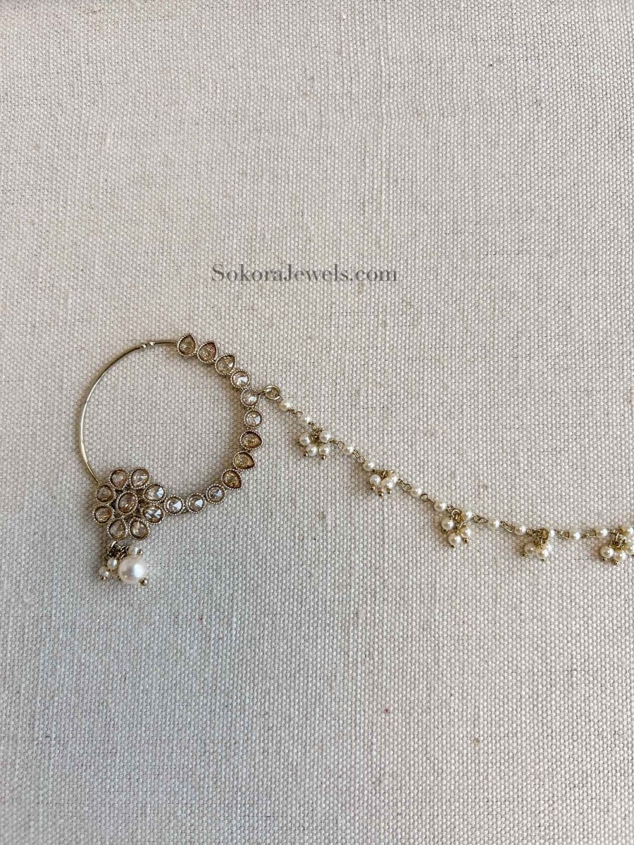 2 inch Antique gold nose ring with champagne stones and pearl beads