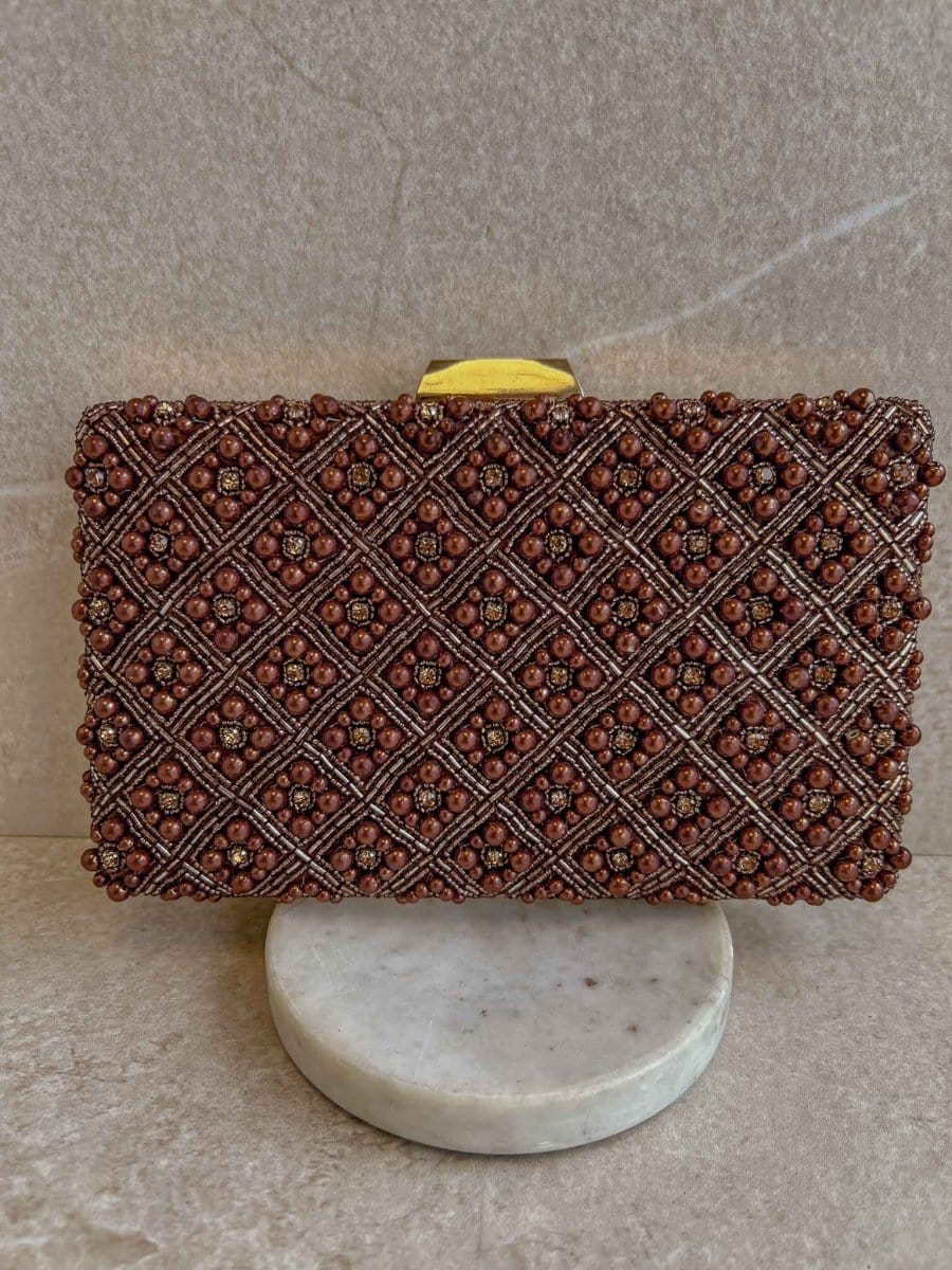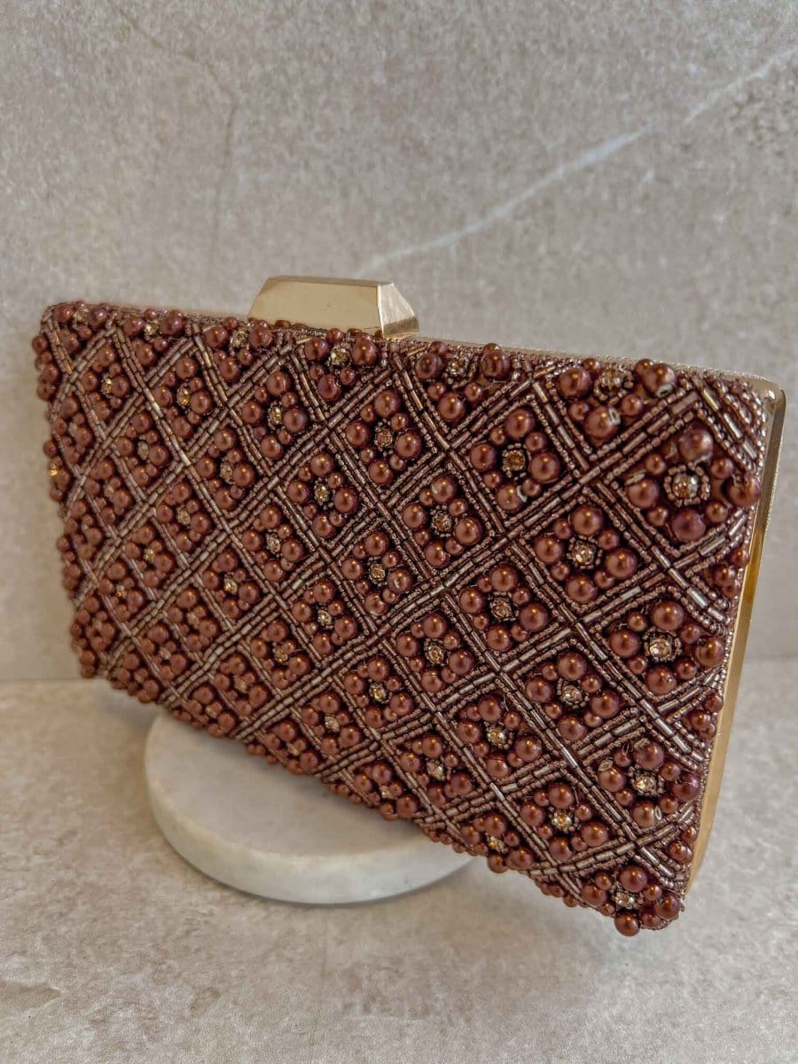Dark copper brown Brown Pearl bead embroidery detail clutch. Embroidery work on one side only. Large enough to fit all modern smartphones. Perfect for brides!