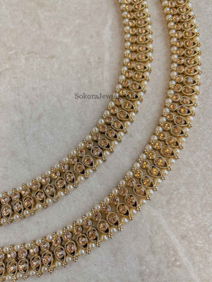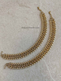 Crystal bead and golden rhinestone detail anklets in antique gold.